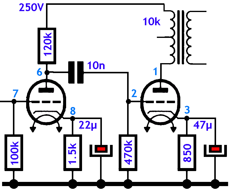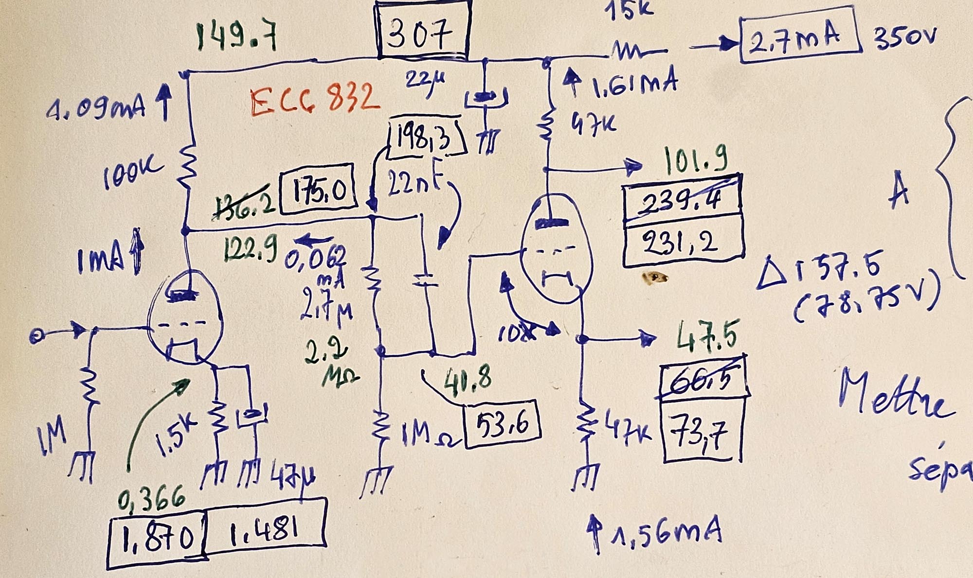 On peut ainsi réaliser un ampli stéréo avec deux lampes. Il faut une haute tension de 250V 25mA maximum. La haute tension doit être filtrée par un électrochimique de 220µF ou plus car un ampli asymmétrique (single ended) ne réduit pas le ronflement de secteur. Un transformateur audio avec une impédance de 10kΩ est difficile à trouver, mais on peut utiliser un petit transformateur d'alimentation de 115 + 115V vers 6V (3 ou 5VA). Le courant permanent dans le primaire est trop faible pour saturer le fer. Si le gain est trop élevé on peut brancher la résistance de 120kΩ au point médian du transfo (s'il a une telle connection). Si le son est trop criard on peut monter un petit condensateur de 47pF entre les deux anodes. C'est une forme de contre réaction de Schade mais qui n'agit que pour les fréquences les plus élevées. Montage standard d'une ECC832Et n'oublions pas le montage standard: un petit montage préampli et déphaseur pour lequel ce tube est normalement destiné. Le premier schéma a été dessiné pendant les tests du circuit pendant que j'optimalise les valeurs des composants. Le meilleur réglage est celui où la tension entre anode et cathode est un peu plus du double de la tension sur la résistance anodique ou cathodique.La tension de sortie mesurée sur l'anode de la seconde triode est de 126Vtt (42Vrms) avec une tension d'alimentation de 307V. La tension à l'entrée est de 900mV, ce qui nous donne un taux d'amplification de 47× comparable à celui d'un ampli avec ECC83.