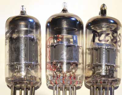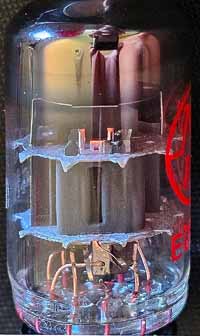 Les deux triodes semblent identiques sur les photos. Elles ont toutes deux une cathode rectangulaire, relativement large pour pouvoir fournir beaucoup d'électrons. La cathode ressemble à une cathode miniature de lampe de puissance. Les lampes ECC82 et ECC83 ont normalement une cathode ronde. Cette lampe ressemble à une double triode PCC88 (mais le branchement est différent). Les anodes n'ont pas la forme des anodes typiques des triodes pour fréquences audio, mais la forme des anodes de triodes haute fréquences: un bloc rectangulaire avec un creux au milieu à la hauteur de la cathode. L'anode est ainsi plus proche de la cathode sans trop augmenter la capacité de Miller. C'est fait pour permettre un courant anodique plus élevé, ce qui est important pour obtenir un meilleur rapport signal/bruit plus. C'est nécessaire dans les triodes préamplificatrices (cascodes) car le signal d'antenne est très faible et ne peut pas disparaitre dans le bruit de fond.