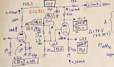 Mais comment savoir si la lampe ECC832 est vraiment une double triode asymmétrique? Il suffit de mesurer le courant qui circule dans chaque triode. Les paramètres sont les suivants: cathode et grille à la masse et anode à +25V. Voici les mesures: triode 123: courant anodique de 2.47mA, triode 678: courant de 0.65mA. On voit directement la différence! Mesures d'autres triodes: