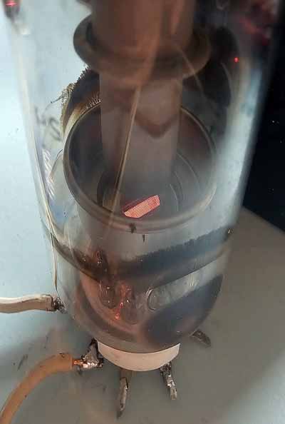 Cette vue nous montre l'ande (le cylindre qui pointe vers le bas) et également la cathode rouge. On voit sur l'agrandissement également les fils de la grille de la triode. Il y a une sorte de blindage, c'est le pot autour du bas de l'anode, avec une découpe pour la cathode et la grille. Le blindage sert surtout à absorber les rayons X, car avec une tension si élevée la lampe produit des rayons X. Les appareils de rayons X sont en fait une grosse diode alimentée par de la très haute tension. Quand les électrons frappent l'anode à haute vitesse, ils produisent des rayons X.