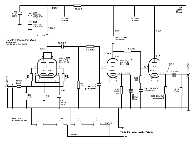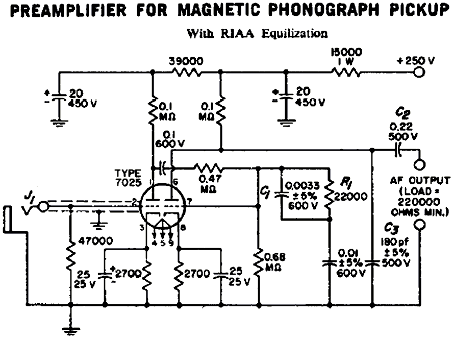 | Vous voulez construire un amplificateur à lampes avec une entrée pour pick up? Il vous faudra normalement une amplification au niveau microphonique (quelques millivolts) et une correction RIAA. Le signal en sortie de ce préampli doit être au niveau CD (750mV environ). |