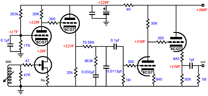 Correction active ou passive?Contrairement au controle de tonalité Baxandall, la correction RIAA est presque toujours passive: la correction doit être très élevée (+20dB) et doit s'ajouter à l'amplification nécessaire (+40dB), cela donne un facteur d'amplification de 60dB au minimum, difficilement réalisable avec deux triodes (pour des raisons de stabilité on limite le nombre d'étages d'amplification dans la boucle de contre réaction à 2).