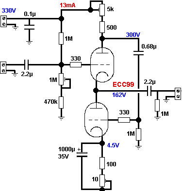 Grâce à l'impédance de sortie qui est très basse (de l'ordre de 10Ω) on peut utiliser des cables de liaison vers l'ampli qui sont très longs. L'impédance d'une cathode suiveuse classique est de 400Ω et est asymmétrique. Le ECC82 supérieur est la cathode suiveuse, tandis que la triode inférieure est la résistance active. La résistance de 330kΩ sert à fixer le point de fonctionnement, pas comme contre réaction du signal. L'amplification de la triode ECC83 n'est pratiquement pas réduite par le rapport des résistances de 1:330 (l'amplification du ECC83 est de µ = 100).