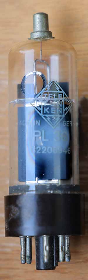 Image 4 à droite: Le PL500 est le successeur du PL36. Ce tube a un soquet magnoval (plus facile à fabriquer et ayant de meilleures caractéristiques) et un cavitrap. Le PL500 était une amélioration du PL36 et a été utilisé (en version PL504) pendant toute la durée de vie des téléviseurs monochromes, ce qui est un gage de la qualité de ce tube. Le tube permet une dissipation anodique de 16W au lieu de 11W et une dissipation de la grille écran de 6W au lieu de 5W. Cette dissipation maximale est définie quand le tube est utilisé dans la déflection horizontale, si le tube est utilisé dans un amplificateur audio la dissipation peut être portée à 22W. Le tube a été utilisé dans quelques amplificateurs audio, mais surtout comme étage de puissance dans les émetteurs radio jusqu'à une fréquence de 30MHz. Le PL36 en version améliorée (avec cavitrap) a été fabriqué simultanément avec le PL500 pour assurer le remplacement des tubes PL36 défectueux (pour qu'il ne soit pas nécessaire de remplacer le soquet d'appareils existants). Le tube nouvelle version pouvait être utilisé à la place de l'ancienne version sans modification du schéma. Le tube amélioré est actuellement très rare.