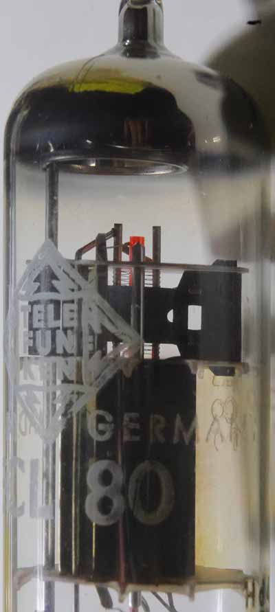 On a également conçu un tube de puissance sur le même principe, le tube ECL80 qui pouvait tout aussi bien être utilisé dans un tourne-disques (6.3V) que dans une télévision (circuit 300mA). Dans ces années là, les utilisateurs se contentaient de peu (même très très peu), ils avaient encore connu la guerre et une puissance de 1W était suffisante. Le tube était utilisé dans les premières télévisions avec une diagonale d'écran de 25cm environ où le tube était mis à toutes les sauces: étage audio, étage vidéo et déflection trame. Le but d'un fabricant était de fournir un assortiment aussi restreint que possible de tubes qui étaient bons à tout faire. Une télévision avait peu de types différents: EF80 pour toute la partie haute et moyenne fréquence (et parfois même l'étage de puissance vidéo), ECL80 pour la déflection trame, la sortie audio et éventuellement vidéo, PL81 et PY81 pour la déflection ligne. C'est de la même période que date le tube EL80 qui était un remplacant du tube EL41 avec soquet rimlock. C'était en fait le même tube, mais avec un autre socquet. On n'en a pas fabriqué des masses, car ce tube n'avait pas de trop bonnes caractéristiques. Pour des raisons qui resteront toujours obscures, ce tube ne pouvait pas être utilisé dans un montage push pull.