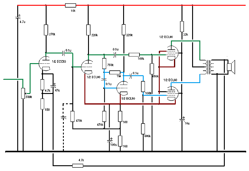 La première triode du tube ECL80 est utilisée en amplificatrice simple, la seconde triode en étage déphaseur. A cause des cathodes connectées il n'y a que le montage paraphase qui puisse être utilisé. Les triodes de l'ECL80 ont un gain faible, ce qui fait que les résistances du montage paraphase sont fort différentes (750kΩ et 1MΩ). L'étage de puissance est lui standard. La puissance est de 3W et la contre-réaction est en option. Quand on utilise la contre-réaction, il faut mettre en plus un petit condensateur de 100pF en parallèle sur la résistance de 4.7k pour éviter les oscillations, mais on peut également réduire le gain de l'ampli pour les fréquences supersoniques par un condensateur (hachuré sur le schéma). Commencez par une valeur de 1nF et controlez que l'ampli soit stable. Si l'étage de puissance à tendance à osciller (même sans contre-réaction), ajoutez des résistances de grille des pentodes de 10kΩ placées le plus près possible des pattes du socquet.