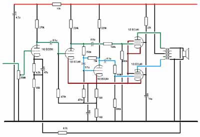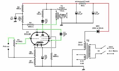 Le pick up n'est pas branché à la masse, mais via un diviseur de tension vers la cathode, car la grille de la triode a besoin d'une autre tension (-4V) que la grille de la pentode (-11V). Il y a une contre-réaction simple de l'anode de la pentode vers l'anode de la triode (R4 de 680kΩ), c'était la méthode la plus économique pour réduire les distorsions. Les aigues sont également atténuées par la combinaison R5 10kΩ et C2 0.01µF. Les fréquences basses sont limitées par le condensateur de couplage de 0.005µF, qui est une valeur très bassen (on utilise normalement 0.01µF). Il vaut mieux limiter les fréquences basses, qui bouffent toute la puissance du petit ECL80.