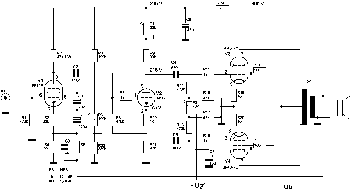 Ce schéma utilise des lampes russes, mais on peut utiliser des lampes européennes à la place: préampli et déphaseur ECF80 ou PCF80, étage de puissance EL84, PL82,... C'est le schéma d'un amateur qui veut trop bien faire et place partout des ajustables. Regardez sur la page du PCF80 pour les valeurs correctes. La lampe 6P43P n'a pas vraiment d'équivalent européen, elle correspond le plus à une EL84. L'équivalent correct de la lampe PL82 est 6P18P. La haute tension est de 300V et est un peu trop élevée pour une lampe EL86, PL84 ou PL82. La tension de polarisation négative doit être réglée pour avoir un courant de repos qui ne dépasse pas les 30mA (300mV sur la résistance de mesure). Ajustez le courant sur 40mA si vous utilisez une tension d'alimentation de 200V avec des lampes PL82, PL84 ou EL86. Si vous avez un ampli, vous pouvez remplacer les lampes EL82 ou PL82 usées par des lampes NOS EL82 ou par des lampes un peu plus modernes EL84 (si la tension d'alimentation est supérieure à 250V) ou EL86 (tension d'alimentation de 200 - 250V). Mais il est important d'indiquer la différence entre toutes ces lampes de manière succinte.