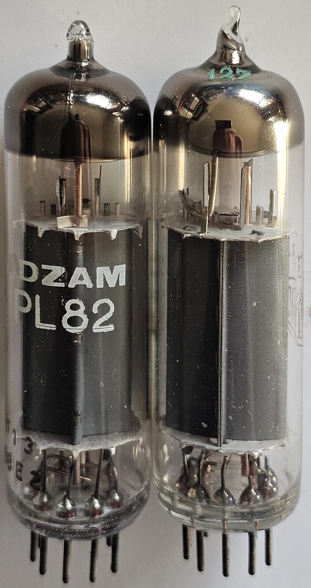 Le PL82 est l'ancètre du EL84. Cette lampe est conçue pour travailler avec une tension un peu plus basse (170 - 200V) présente dans les téléviseurs de l'époque (avec diode thermo-ionique pour le redressement). Elle peut tout aussi bien être utilisée comme amplificateur audio et comme étage de puissance dans la déflection trame (comme beaucoup de lampes de cette époque). Il existe également une version 6.3V (EL82). C'est une vraie pentode: plus tard les lampes de déflection trame (PCL805) et puissance audio (PCL86) seront des tétrodes à faisceaux dirigés. C'est surtout pour la déflection magnétique qu'un rendement élevé est interessant. La taille de la lampe (anode) est identique à celle d'une lampe PL84 (et EL84), mais la dissipation anodique est limitée à 9W, c'est probablement pour tenir compte de son utilisation dans un étage de déflection trame où il y a des pics de courant et de tension plus élevés. Le brochage est identique. Une différence importante entre une PL82 et une PL84 c'est que la PL82 a le pas de la grille écran qui ne correspond pas à celui de la grille de controle (le pas de la grille écran est environ 2× plus lâche). En ce sens, la lampe PL82 correspond le plus à une lampe EL84. Le résultat est que le rendement de la lampe PL82 est plus mauvais que celui de la PL84. Dans un ampli SE, 19% du courant se perd via la grille écran (il est de 8% pour une PL84). Certaines personnes trouvent le son d'une pentode "desaxée" (PL82, EL84) plus agréable que celui d'une pentode à faisceaux dirigés (PL84, EL86) et c'est ainsi qu'on a eu une recrudescence de la demande de lampes PL82. Mais pourquoi vous compliquer la vie? La PL82 nécessite une tension de chauffage de 16V (5W) tandis qu'une EL84 peut tout simplement être chauffée avec du 6.3V.