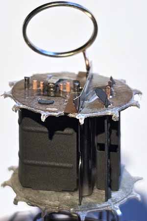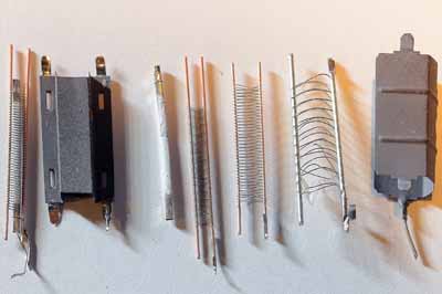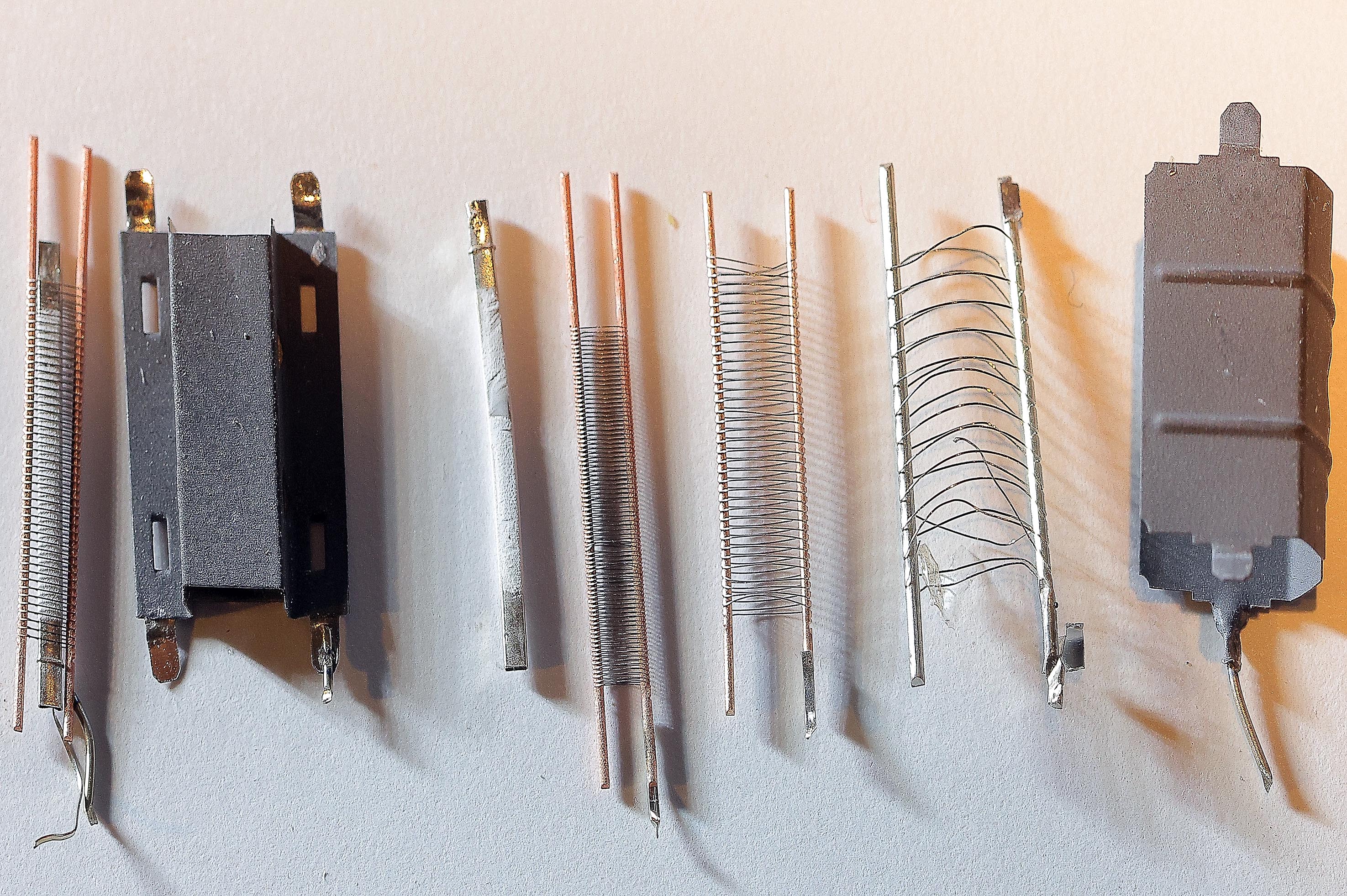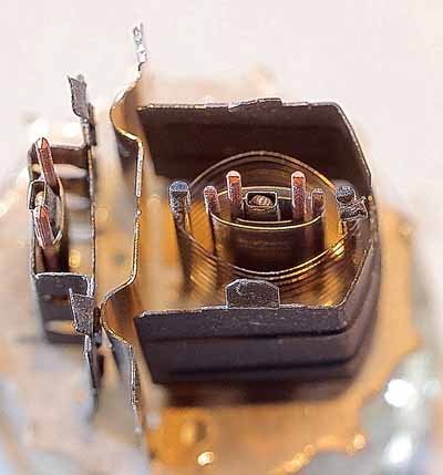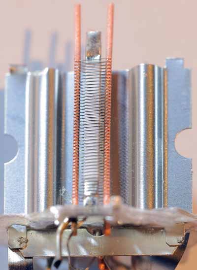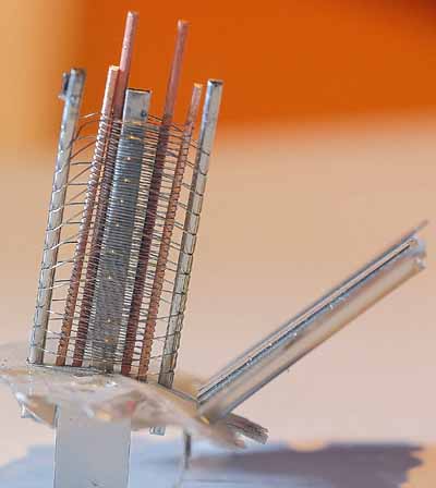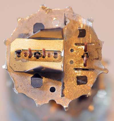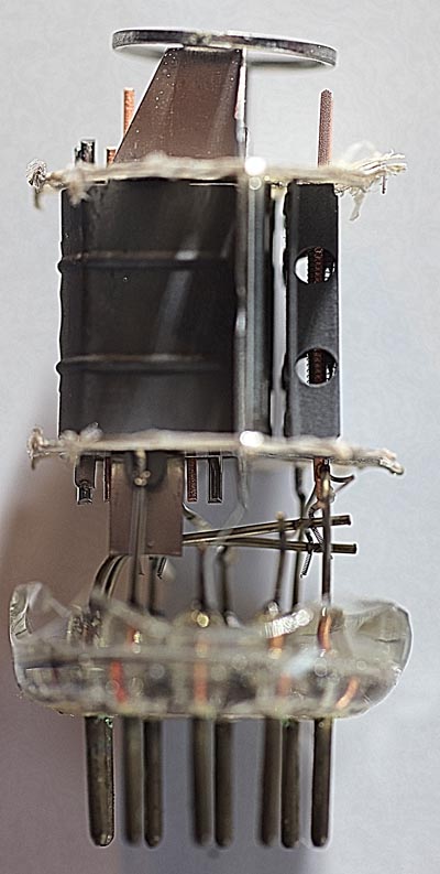 La dissipation de la pentode est limitée à 1.7W: aussi bien le couant maximal que la dissipation maximale sont des facteurs qui limitent la puissance de l'ampli. La tension anodique est fixée à 170V. La dissipation de la grille écran est de 500mW, ce qui limite le courant de la grille à 3mA. Avec un courant anodique de 10mA on arrive à la dissipation maximale de 1.7W. La lampe peut fournir une puissance de 500mW dans un amplificateur single ended. Dans un amplificateur push pull avec polarisation par résistances cathodiques le point de fonctionnement est fixé en classe A et la puissance n'est pas plus élevée que 1W mais les distorsions sont moindres. Et puis... quand j'écoute la radio le matin j'ai assez avec une puissance de 250mW. Juste après la seconde guerre mondiale on a fabriqué des postes de radio bon marché avec une pentode radiofréquences EF80 comme tube de puissance (parce que ces lampes étaient fabriquées en grandes quantités et étaient bon marché). Et la puissance d'une EF80 est encore plus basse que celle d'une PCF80. PCF802Cette lampe ressemble fort a la lampe PCF80. On peut les séparer, car l'anode de la triode a une construction symmétrique, compare la photo en haut à droite et la photo ici.