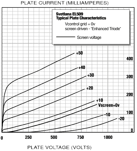 On voit qu'une tension de grille écran de 50V permet d'atteindre un courant anodique de plus de 300mA (ce qui est amplement suffisant pour fournir une puissance de 70W dans un ampli push pull). Le graphique est destiné à un montage à commande par la grille écran ("enhanced triode"), avec la tension de grille de controle à 0V, mais on peut augmenter la tension de g2 à 100V si on utilise une tension de g1 négative. Avec la grille de controle à 0V, on a la sensibilité la plus élevée du tube. On peut obtenir pratiquement les mêmes caracteristiques avec une commande sur g1 plus normale. La tension de g1 doit être suffisamment négative pour qu'elle ne devienne pas positive pendant les pics de modulation. La tension de g2 peut alors être plus positive, jusqu'à 160V stabilisée.