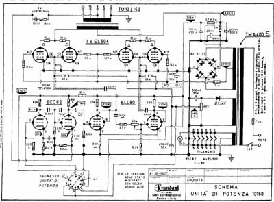 Amplificateur avec EL504 doublePourquoi utilisait-on tant de tubes de déflection ligne dans les amplificateurs, alors qu'il existe des tubes de puissance audio spécialement adaptés comme les EL34? C'est bien simple: pratiquement tout le monde avait une télévision, tandis que pratiquement personne n'avait un amplificateur à la maison (tout au plus un poste de radio avec un vulgaire EL84 pour fournir 4W. Toutes les télévisions avaient nécessairement un étage de déflection, utilisant à chaque fois des PL81 (début des années 1950), PL36 (fin des années 1950), PL500 et PL504 (à partir des années 1960). Il y avait donc énormément de tubes de déflection lignes qui étaient fabriqués, qui étaient bon marché, tandis que les tubes EL34 étaitent rares et très chers. Les tubes de déflection ligne conçus pour un courant et une tension très élevée avaient une très bonne réputation: utilisés comme amplificateur audio, ils étaient réputés indestructibles (surtout la série de tubes magnoval PL500 et PL504), même s'ils étaient utilisés en delà de leurs caractéristiques dans un ampli audio. Le tube EL34 avec son soquet octal n'avait lui pas trop bonne réputation.L'amplificateur de sonorisation présenté ici se compose d'un préampli et d'un ampli. Il utilise un tube ECC82 dont une triode sert d'amplificatrice de tension et la seconde triode de comparatrice (elle reçoit la contre réaction sur sa cathode). L'étage suivant est l'étage de commande des tubes de puissance. Il s'agit d'une double pentode ELL80 montée en déphaseur long tail. Pour équilibrer les deux sorties, on prélève une partie du signal de la première pentode pour l'envoyer à la seconde. Le montage devient ainsi pratiquement une paraphase flottante. Le tube ELL80 est une double pentode pouvant fournir 2 × 3W (stéréo) ou 8.5W en montage push pull. Contrairement aux tubes de la série PL504/EL504 c'est un tube assez rare qui n'avait pas très bonne réputation utilisé comme amplificateur audio. Le tube est ici branché en triode avec une résistance de charge de 10kΩ qui est son impédance de sortie quand le tube est utilisé en pentode. Chaque pentode commande deux tubes de puissance EL504 qui ont une polarisation par tension négative (-40V: c'est un ampli qui travaille très près du cutoff, donc très près de la classe B). La tension sur la grille G2 est de 210V, celle sur l'anode de 420V. Il y a un pontage X-Y qui coupe la tension de g2 quand le préampli n'est pas connecté (fonction mute et forte réduction de la puissance des tubes). L'amplificateur de sonorisation pouvait fournir une puissance musicale de 160W. Je crois que maintenant vous avez assez d'exemples de schémas qui utilisent des tubes de déflection ligne comme étage de puissance! Tous les circuits ne sont pas destinés à une écoute haute fidélité. Amplificateur de sonorisation 40WUn amplificateur de sonorisation avec une paire de EL500, encore une utilisation de ce tube dans la sonorisation. On a construit de tels amplificateurs jusqu'à la fin des années 1970. Le EL500 est comparable au EL504 (surtout en utilisation audio). Le EL504 résiste un peu mieux à la très haute tension présente dans les téléviseurs, mais cela n'est pas nécessaire ici. On trouve encore beaucoup de EL500 et EL504 en condition NOS et ils sont nettement moins chers que les KT77 ou EL34.Il y a un préamplificateur séparé (microphones et entrée pick up). La sensibilité de l'ampli est de 775mV eff. La première double triode amplifie le signal (750mV eff.), la seconde reçoit également le signal de contre réaction sur sa cathode. La double triode utilisée est une ECC82 à faible gain, deux triodes sont ici nécessaires alors qu'avec un ECC83 une seule triode aurait suffi. Le ECC82 a une meilleure linéarité en comparaison du ECC83. La seconde double triode est un montage long tail - paraphase flottante qui commande les tubes de puissance. La basse impédance est possible avec un ECC82: la résistance de grille de commande du tube de puissance est de 56k. La tension de la grille de commande des tubes de puissance est de -29V produite par un bobinage séparé. La tension de la grille écran est de 160V en provenance du point milieu du transfo d'alimentation. La haute tension est de 325V. Cet amplificateur pouvait fournir une puissance de 40W (aucune indication du taux de distorsion). Cet amplificateur peut parfaitement être restauré et même être construit avec des composants modernes. On utilisera un transfo de séparation secteur (230 vers 115 + 115V) pour la haute tension et un transfo séparé pour la tension de chauffage. Un transfo de 12V se trouve plus facilement qu'un transfo de 6.3V. Le chauffage des tubes de puissance sont alors branchés en série et les ECC82 sont branchés entre la patte 4 et 5 (la tension de chauffage est alors de 12.6V). La tension de chauffage doublée et redressée fournit la tension négative. Le transfo audio est un exemplaire de 25W, impédance de 3.3 + 3.3kΩ, on limite la puissance à un peu plus de 20W pour avoir une excellente qualité sonore. On peut augmenter la résistance de polarisation des tubes de puissance de 56k à 150k. Cette basse valeur a probablement été choisie pour assurer en toutes circonstances la stabilité de l'amplificateur. Le transfo haute tension doit avoir une puissance de 75VA pour un ampli stéréo, le transfo de chauffage une puissance de 50VA. ![]() Le schéma de la partie puissance d'un ampli stéréo Braun CSV60 de 1962 utilisant deux ECF80 et quatre EL500 pour une puissance de 2 X 30W (distorsion inférieure à 1%). La bande passante va de 40 à 15kHz (à 1dB près). l est fait usage de tubes spécialement destinés à la télévision, qui étaient fabriqués en grandes séries et étaient moins chers que le tubes audio spécifiques (ECC83 et EL34). Le schéma de la partie amplificateur est particulièrement simple, avec une triode-pentode ECF80 comme 