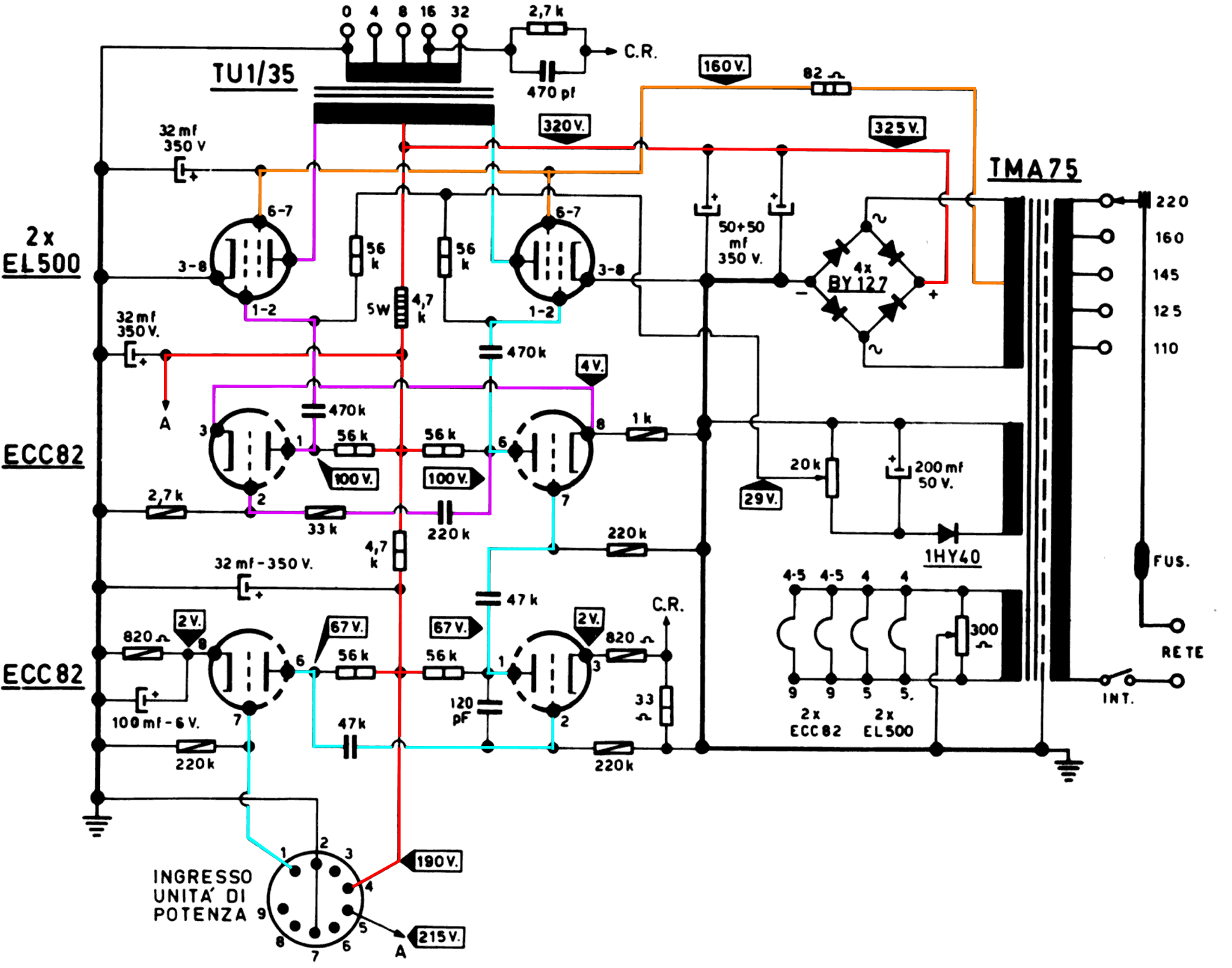 ![]() Amplificateur avec PL500 (30W)Les PL500 peuvent être remplacés par une paire de PL504 si vous voulez réaliser ce montage. Il s'agit ici d'un amplificateur microphonique.L'étage préamplificateur utilise un ECC83 avec une amplification fixe de 33×. La triode double suivante permet le controle de tonalité. Ces deux étages peuvent être éliminés si la source a un niveau élevé (lecteur de CD). Nous avons ensuite l'amplificateur à proprement parler avec un préampli (avec contre-réaction poussée) et étage déphaseur en montage concertina. Ce montage est possible ici, car il est suivi d'un étage de commande pour attaquer les tubes PL500. L'étage de commande est un montage à anode commune (cathode suiveuse) avec ECC82. Il y a deux trimmers: l'un permet de régler le courant de repos dans les tubes de puissance (polarisation négative) tandis que l'autre permet de balancer les deux tubes de puissance. On notera ici également la présence d'un circuit de correction de phase (68pF + 33kΩ) pour permettre un fonctionnement stable avec contre-réaction.