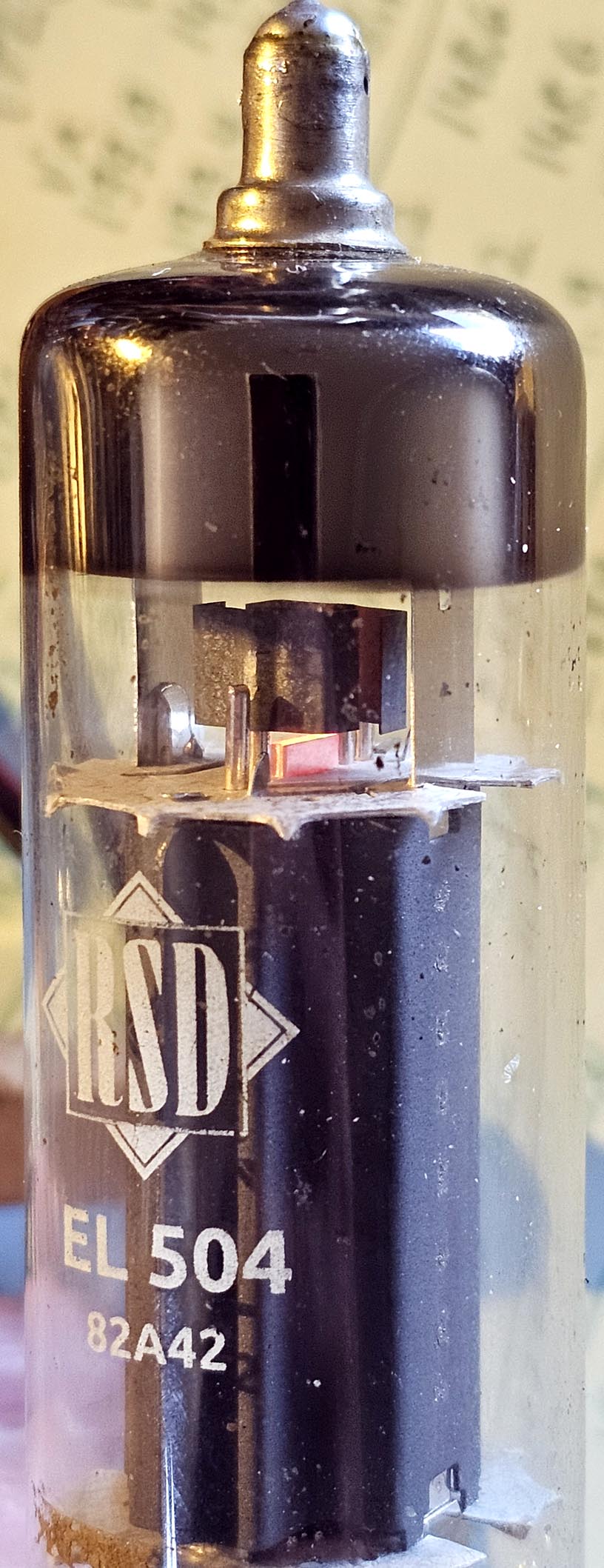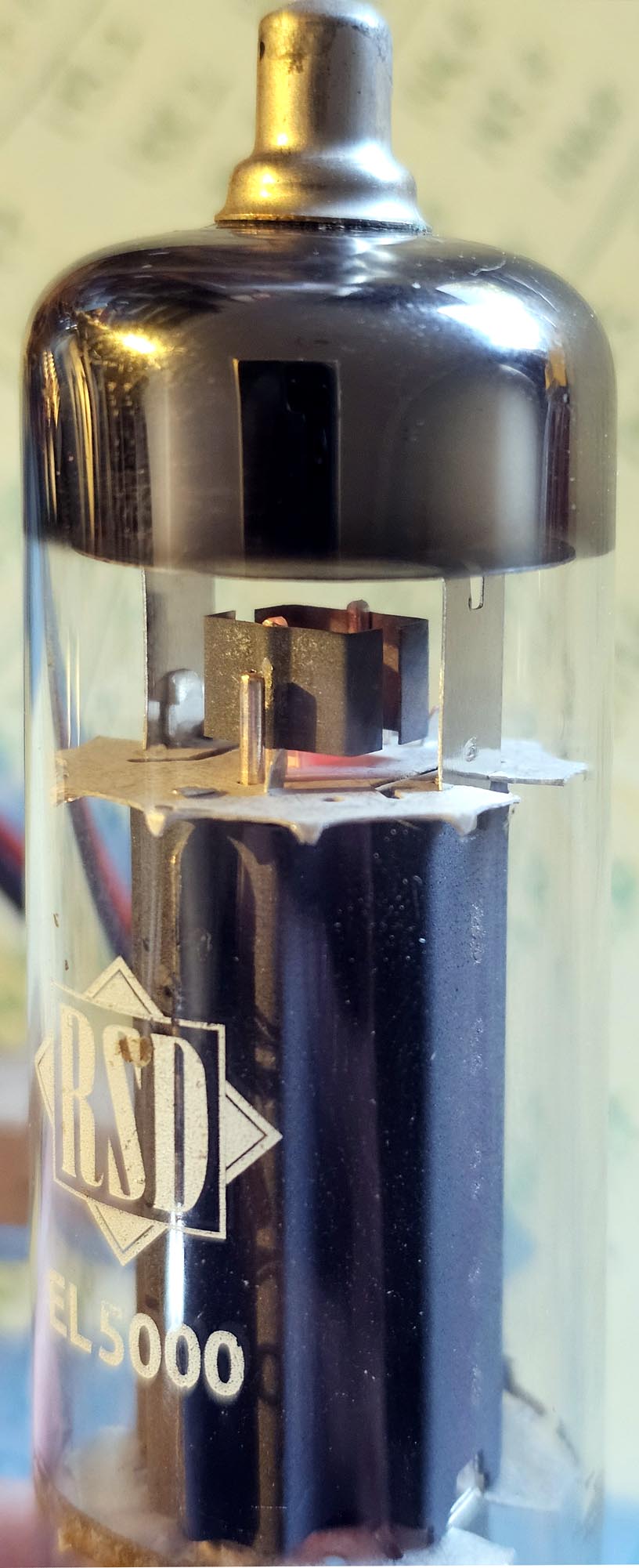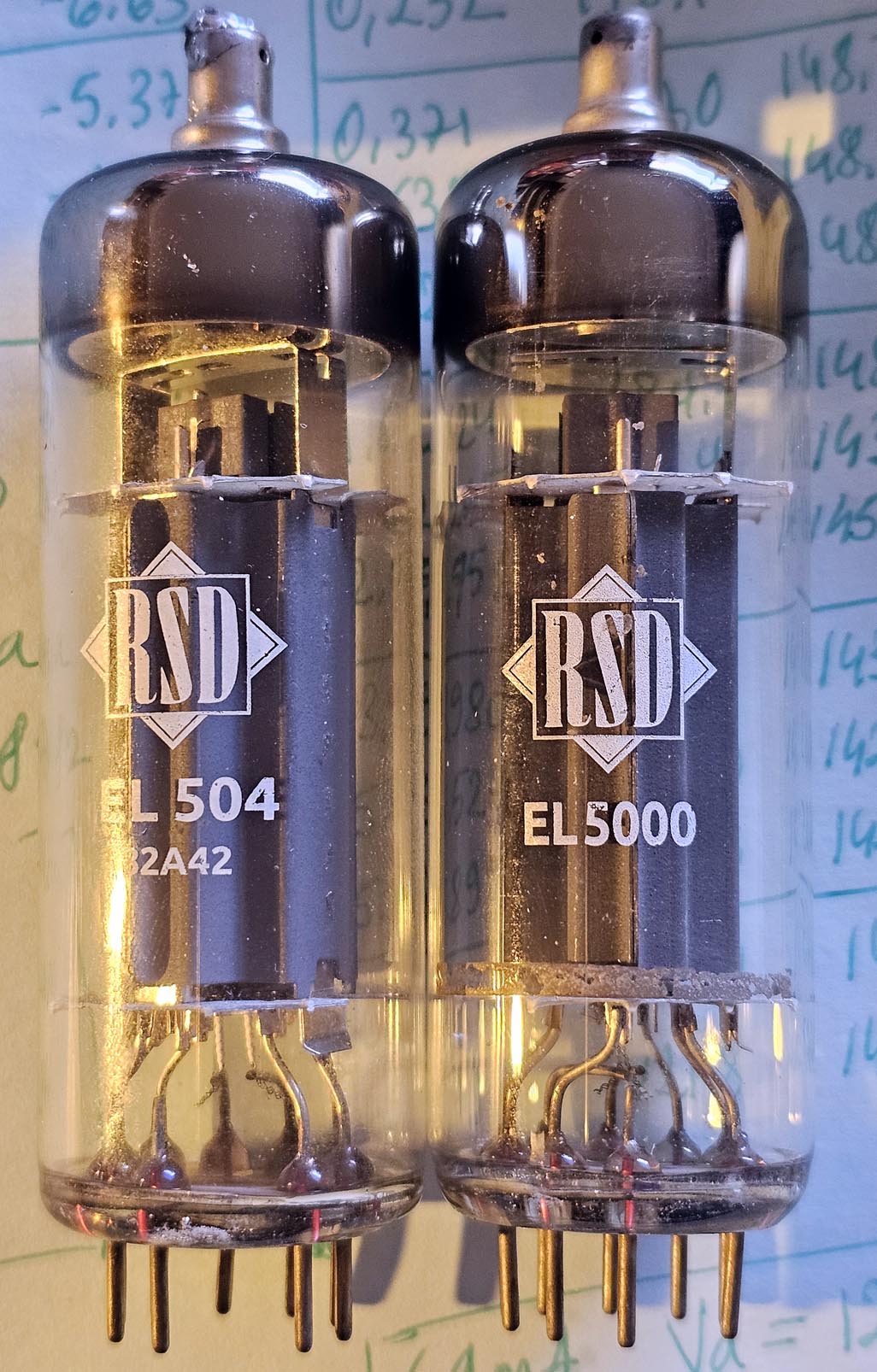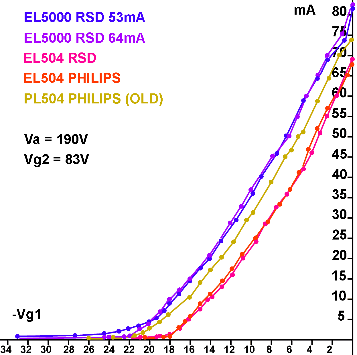 Les lampes EL504 et EL5000 se ressemblent totalement: même forme et placement des ailettes de refroidisseur sur les tiges des grilles de controle, même forme de l'anode, même placement des différents "accessoires" dans le ballon (getter, contact vers l'anode, fils des broches vers les électrodes, découpes dans les micas, ...). La lampe EL5000 a encore des traces de la bande métallique distinctive en bas du verre, cette bande est typique des lampes de déflection lignes. La seule manière de vraiment se rendre compte s'il s'agit des mêmes lampes, c'est d'en tirer les courbes. Il ne suffit pas de mesurer le courant anodique à une certaine tension, car cela ne permet pas de bien faire la différence.   Et ici on voit qu'il s'agit de lampes vraiment différentes: les lampes EL5000 entrent déjà en conduction à une tension plus négative (la première mesure (point coloré) se fait à 0.1mA). Le courant relativement faible pour de telles lampes de déflection provient de la tension de grille écran relativement basse. J'ai spécialement choisi cette tension plus basse pour ces raisons: