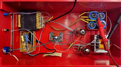 A droite; Sur le net on voit assez bien de circuits single ended (SE) utilisant ce tube ou un autre tube de déflection: C'est vraiment mal utiliser les potentialités de cette lampe. Dans un tel montage ce tube peut fournir au mieux une puissance musicale de 4W à 5W, pas beaucoup mieux qu'un EL84. Le seul avantage d'utiliser un tube de déflection, c'est que cette puissance peut être obtenue avec une tension plus basse (et un courant plus élevé).