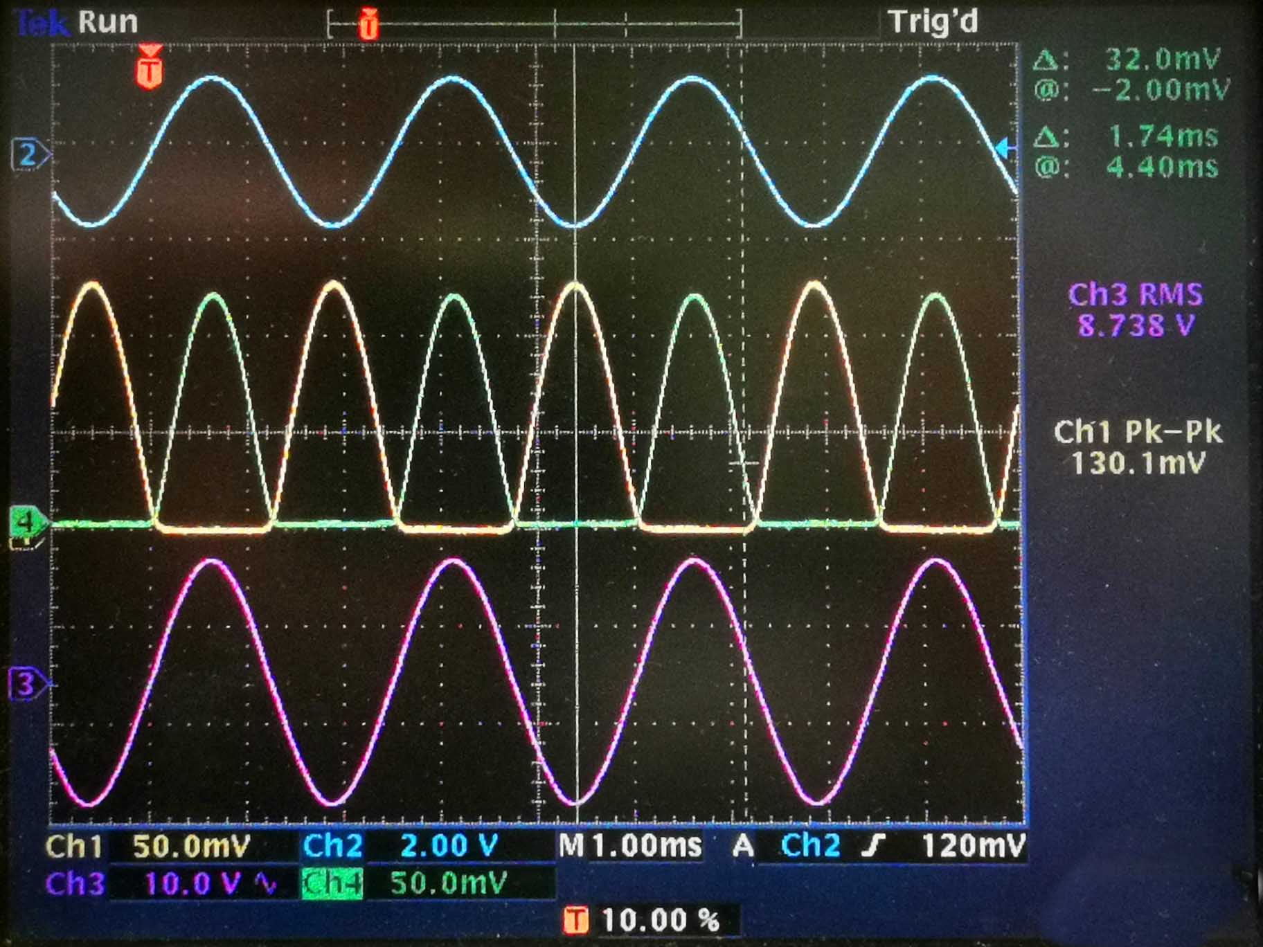 Point de fonctionnement optimal (push pull)Le point de fonctionnement le plus efficace du PL508 est une classe AB avec un courant de repos d'environ 10mA (tension de polarisation de -28V), haute tension de 300V, tension de grille écran de 200V. Ne descendez pas en dessous de 5mA, le son devient bouché.L'ampli push pull permet une puissance maximale de 20 à 40W. C'est un tube qui a une très longue durée de vie, les tubes de déflection des téléviseurs couleurs étaient produits pour tenir le coup très longtemps sans modifications des caractéristiques (ce qui dans le cas des téléviseurs couleurs aurait causé un dérèglement des couleurs à l'écran). Ce tube se situe entre le PCL805 qui peut fournir une puissance de 10W (push pull classe AB) et le PL504 qui peut fournir 50W. Ce tube tout mignon a comme avantage qu'il n'a pas de téton d'anode. Il n'y a donc aucun risque de toucher la haute tension. Les paramètres de fonctionnement (image d'oscilloscope): haute tension: 276V repos, 269V signal maximum, g2: 195V repos, 192V signal maximum, g1: -27V (ajustable pour avoir le taux de distorsion le plus bas possible) Courant cathode: 8mA repos, 130mA en pointe. Courant de g2: 1mA au repos, 4.4mA maximum. Tension de commande sur g1: 50Vpp. Vous voyez successivement le signal à l'entrée, les deux courants cathodiques (mesurés par une résistance de 1Ω) et la tension de sortie (résistance de 7.5Ω). En modifiant la tension de polarisation négative, on peut égaliser le courant de repos des deux tétrodes, mais pas le courant en pointe, qui dépend de l'état des lampes (lampes de récupération). Les lampes neuwes ont des caractéristiques semblables.