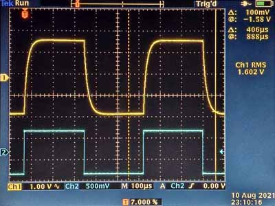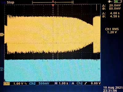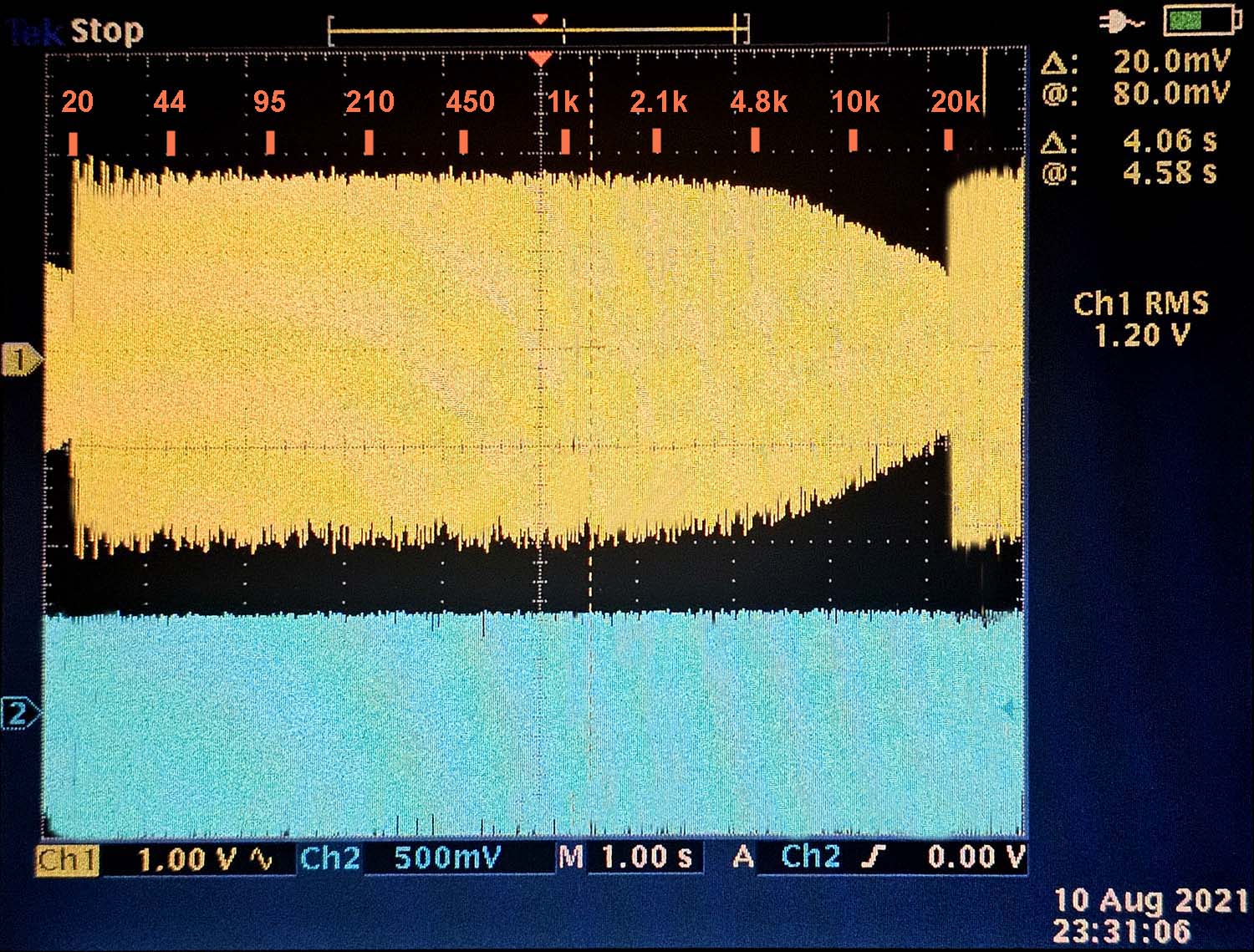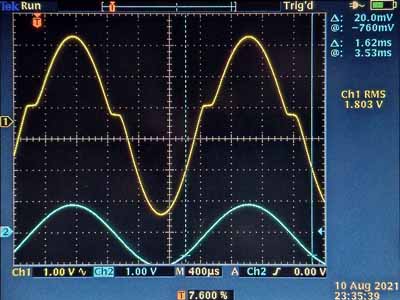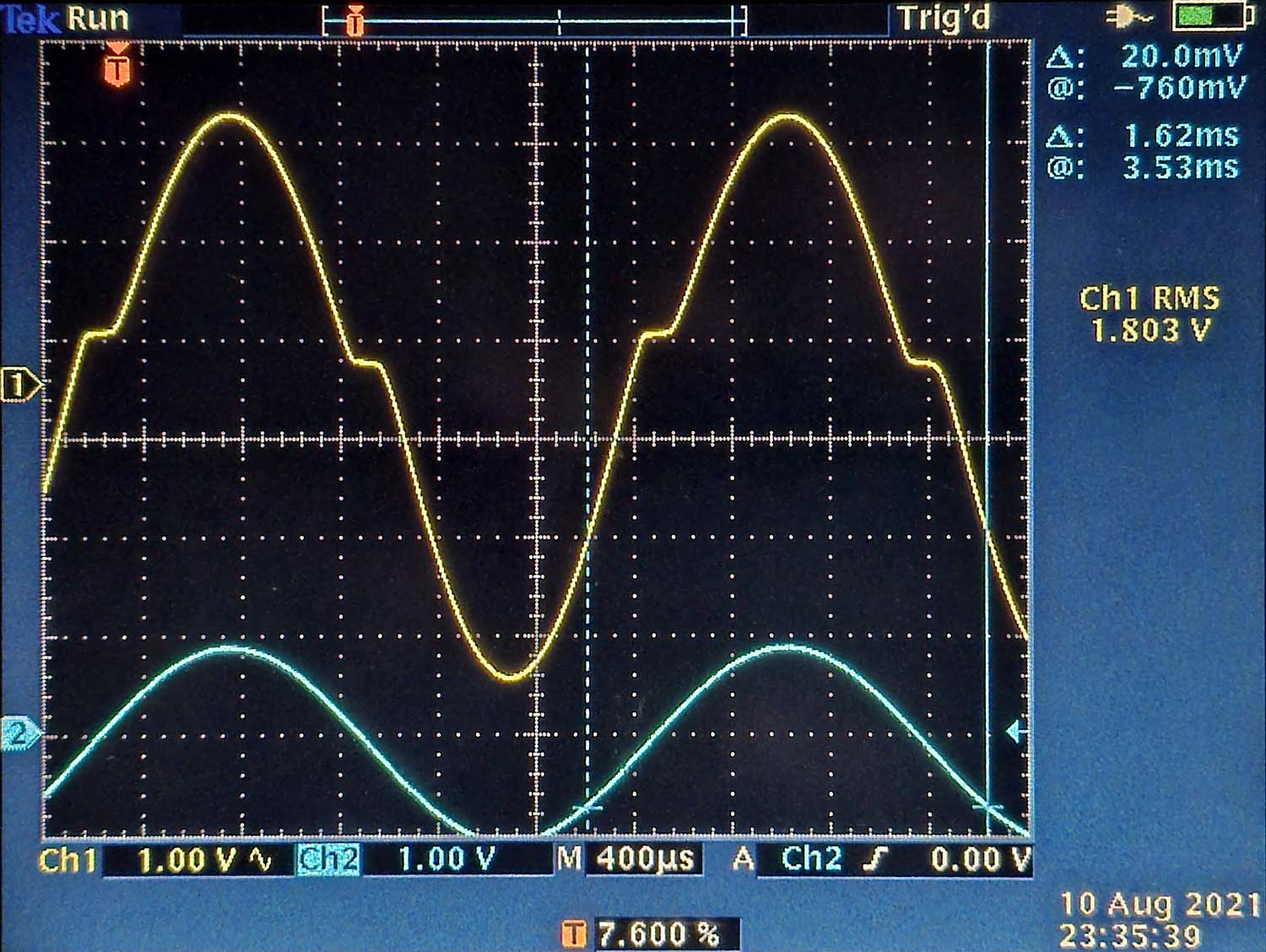 J'avais parfois des légères tendances à l'oscillation haute fréquence avec un vrai haut parleur. Cela a été corrigé avec un filtre branché en parallèle sur la sortie, 10Ω et 0.1µF en série. Même les amplificateurs à transistors ont un tel filtre. On voit que les parties horizontales diminuent à 125Hz: c'est normal et c'est causé par la bande passante limitée de l'ampli. Un ampli srpp ne produit pas une puissance élevée et il ne faut pas perdre des watts dans les très basses fréquences. Mais on va voir plus loin que le rendu des basses est bon. L'image d'oscilloscope à 440Hz est très bonne, avec une légère chute des horizontales et des flancs qui ne sont plus totalement verticaux. C'est un amplificateur à lampes, pas un truc à transistors. L'effet est plus prononcé à 1800Hz, les flancs sont maintenant fort courbes. C'est causé par la bande passante qui a été limitée dans les hautes fréquences. D'ailleurs, j'entends plus rien au dessus de 16kHz, cela ne sert à rien d'amplifier des signaux de plus de 20kHz, l'amplificateur étant conçu pour un ex collègue de travail, qui a environ lemême age que moi. Le dernier graphique est celui du sweep, la variation logaritmique en fréquence d'un signal sinusoidal, de 20Hz à 20kHz. La courne n'est pas "ronde" comme celle d'un ampli sans contre réaction et dont le transfo de sortie est un peu faiblard. L'amplification est bonne à partir de 20Hz et la diminution de l'amplification commence à partir de 10kHz. L'amplificateur SRPP est un vrai amplificateur push pull et non pas un amplificateur single ended. Cela se voit très bien sur la dernière image. Dans un bon amplificateur le second tube doit prendre la relève au moment où le premier tube sort de conduction, ce qui n'est pas le cas ici. Il y a un moment où aucun tube n'est en conduction. Cela peut être résolu très facilement en augmentant le courant de repos dans les tétrodes, c'est le réglage de la tension de polarisation négative de la tétrode basse. La tension était de -25V pour la photo, elle doit normalement être de -11V (controlez le courant via la résistance de 1Ω, il doit être d'environ 60mA). Je publie presque toujours les courbes de mes amplificateurs. J'ai une fois réalise la courbe en fréquence d'un ampli made in China, c'était désastreux. Beaucoup d'amplificateurs amateurs (principalement des ingle ended, plus facile à réaliser) ont une courbe en réponse encore pire, sans basses et sans aigues. |