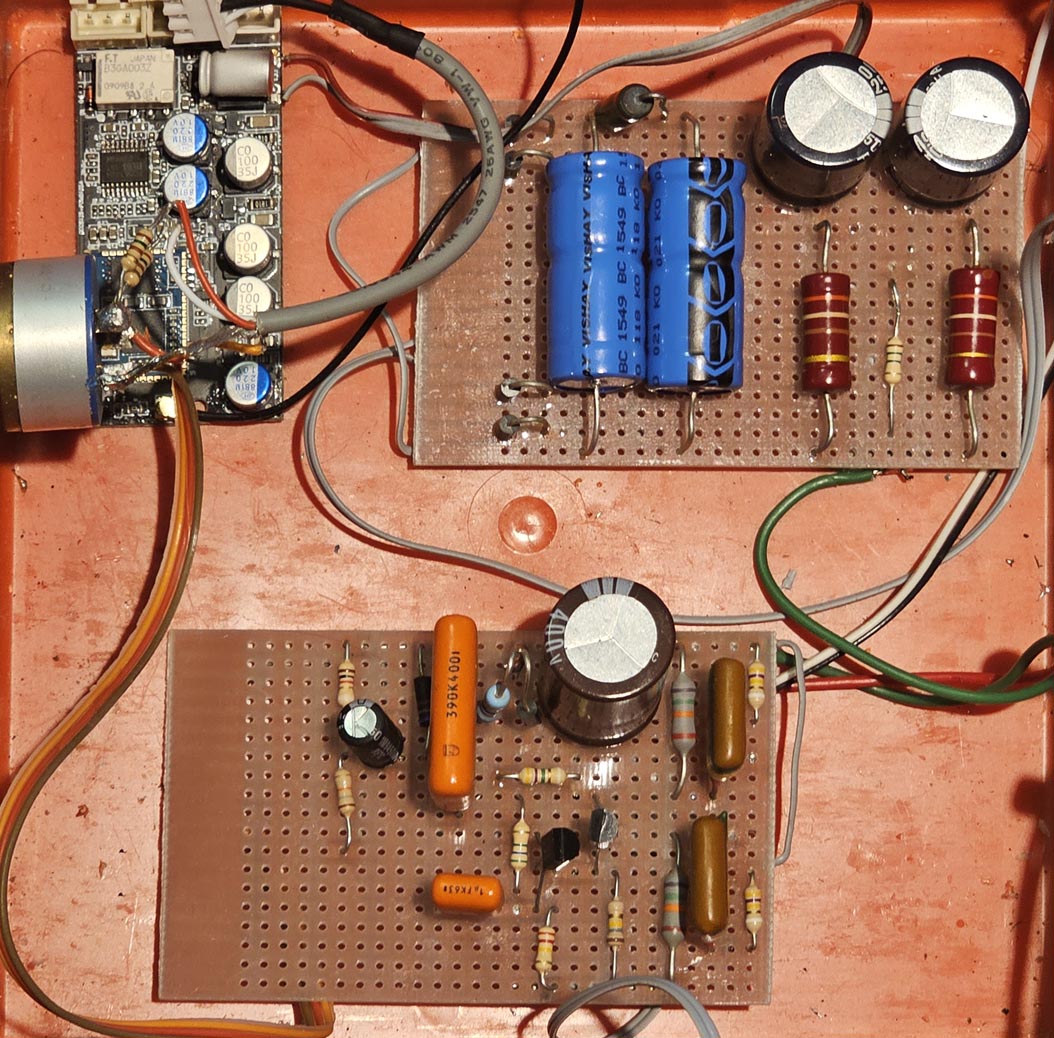 Image à droite: configuration de test avec module bluetooth à gauche en haut, à coté l'alimentation du module et la polarisation par résistances cathodiques (les tests ont été effectués avec des résistances de 390Ω pour essayer le low loading). Le circuit en dessous est le préampli complet. Il y a encore un peu de place car j'avais prévu un petit préampli à l'entrée, mais il n'a pas été nécessaire à cause du facteur d'amplification plus élevé des lampes de puissance grâce à la tension des grilles écran plus basse.