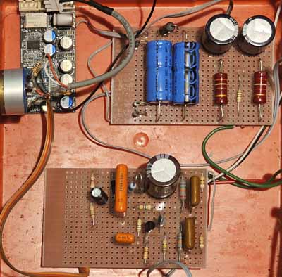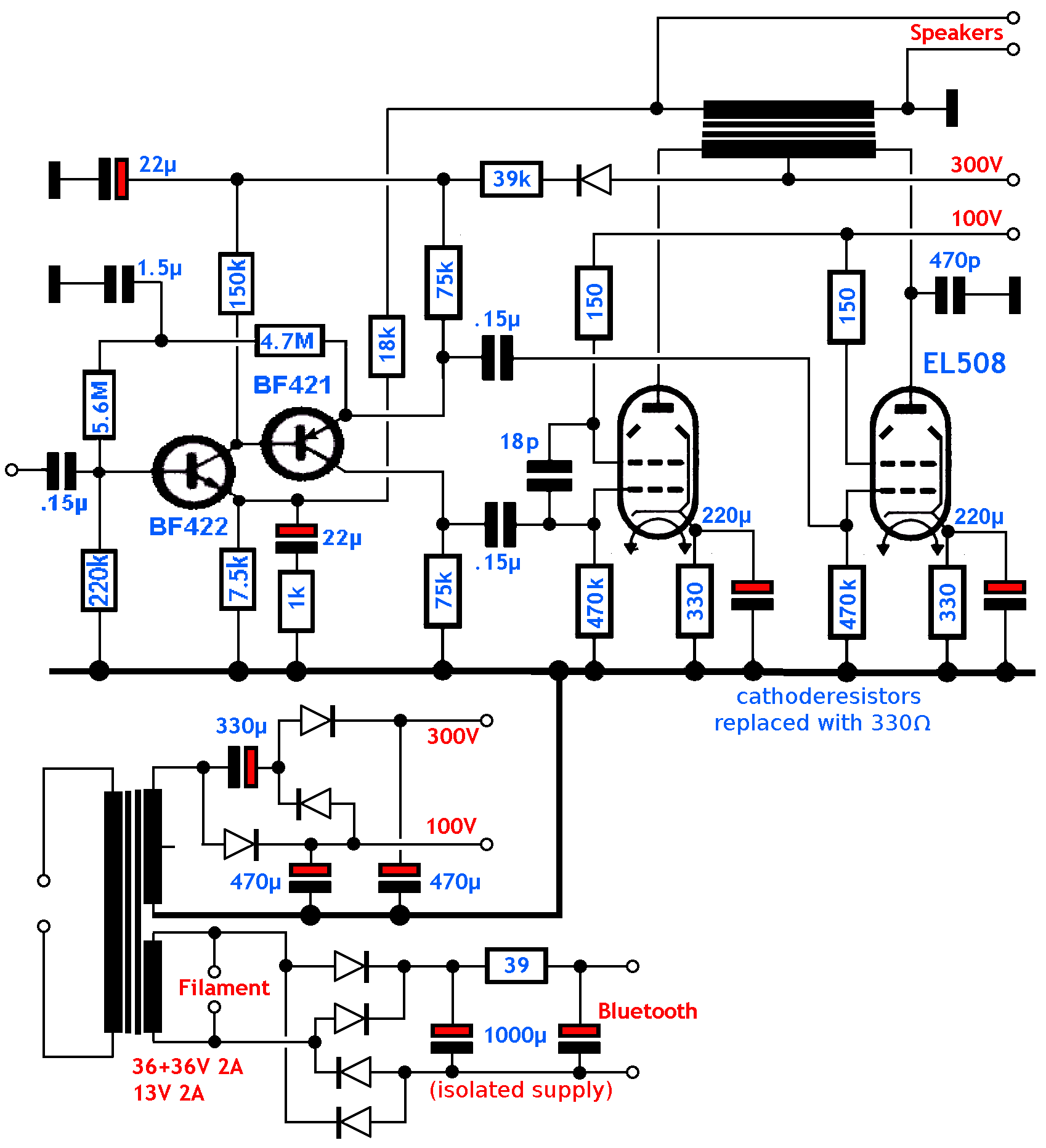 L'ampli reçoit le signal de mon ordinateur, mais a également une entrée bluetooth. Ce récepteur bluetooth a besoin d'une alimentation séparée autrement le récepteur produit un bruit de fond très prononcé et des parasites divers perturbent la réception. L'alimentation en 13V ne peut ainsi être utilisée que pour la tension de chauffage (deux filaments en série) et pour le module bluetooth.