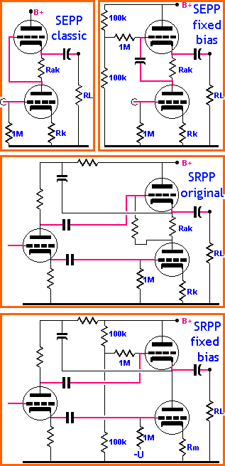 Series/Shunt Regulated Push Pull (SRPP)Le "S" de SRPP veut tout aussi bien dire Serie que Shunt. En effet, si les tubes sont branchés en série vu de l'alimentation (c'est le réseau cyan), ils sont en parallèle vu de la charge (réseau rouge, où c'est soit le tube supérieur qui augmente la tension à travers la charge, soit le tube inférieur qui réduit la tension à travers la charge). Pour ce même montage on retrouve également la dénominsation Single Rail Push Pull qui n'est pas exacte, pratiquement tous les amplificateurs à lampes ont une tension d'alimentation unique (single rail).Le nom SRPP est le plus souvent utilisé pour ce type d'amplificateur. Dans certains circuits on va également commander le tube supérieur, c'est ce que j'appelle le montage MBLE, mais il existe de nombreuses variantes comme le montage Futterman.