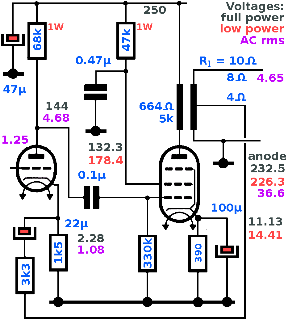 | La lampe PCL805 peut également être utilisée dans un amplificateur single ended. Voici le schéma de base et le schéma abouti que vous pouvez utiliser. |