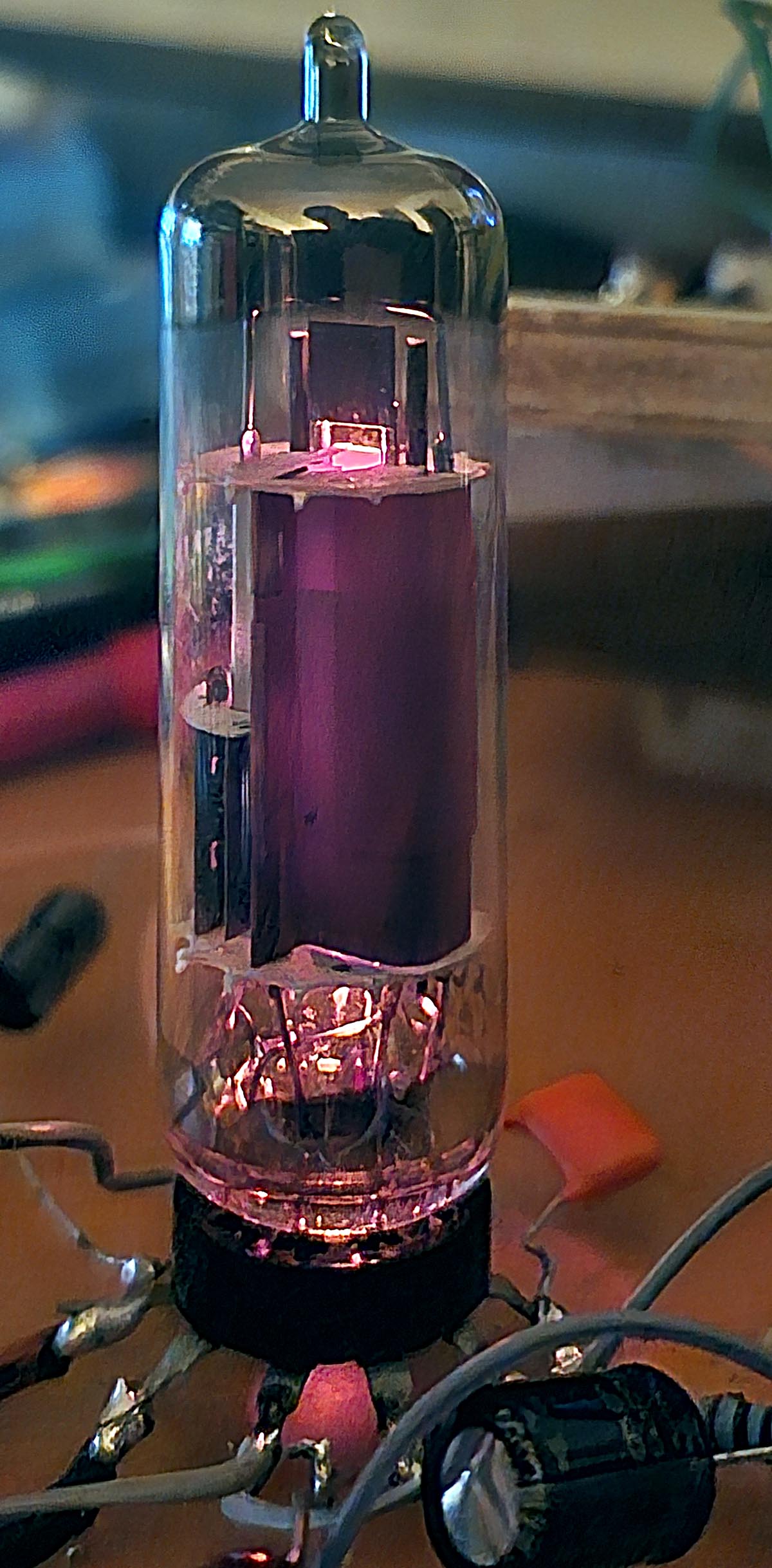Test à 300VJ'ai momentanément augmenté la tension à 300V, ce qui me permet d'obtenir une puissance de 3.1W, mais la dissipation au repos est maintenant de 12.7W. C'est plus que la dissipation maximale admissible qui est de 10.5W et l'anode devient rouge sous le bombardement d'électrons. Cela a des répercussions sur le fonctionnement à longue échéance de la lampe et n'est pas recommandé (libération de molécules hors de l'anode qui vont fausser le fonctionnement de la lampe).La seule solution c'est d'utiliser une alimentation séparée pour la grille écran, par exemple avec un transfo d'alimentation avec prise médiane (110 + 110V). On peut également stabiliser la tension avec un régulateur, c'est ce que nous allons faire plus loin.