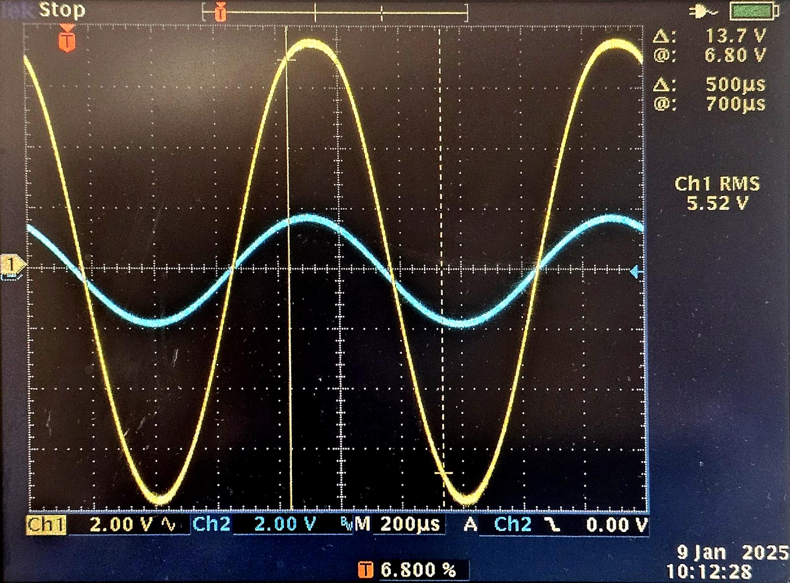 L'image d'oscilloscope montre la tension de sortie avec une alimentation de 300V. La puissance maximale à 300V est de 3.1W (d < 0.1%) Mais l'histoire n'est pas finie et nous allons utiliser le même circuit pour la lampe PCL86. Cela devrait être fantastique, car cette lampe a spécialement été conçue pour cette application (amplification audio). |
