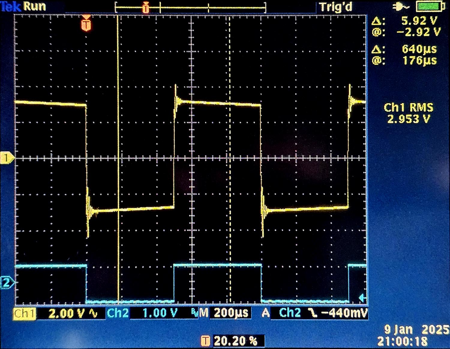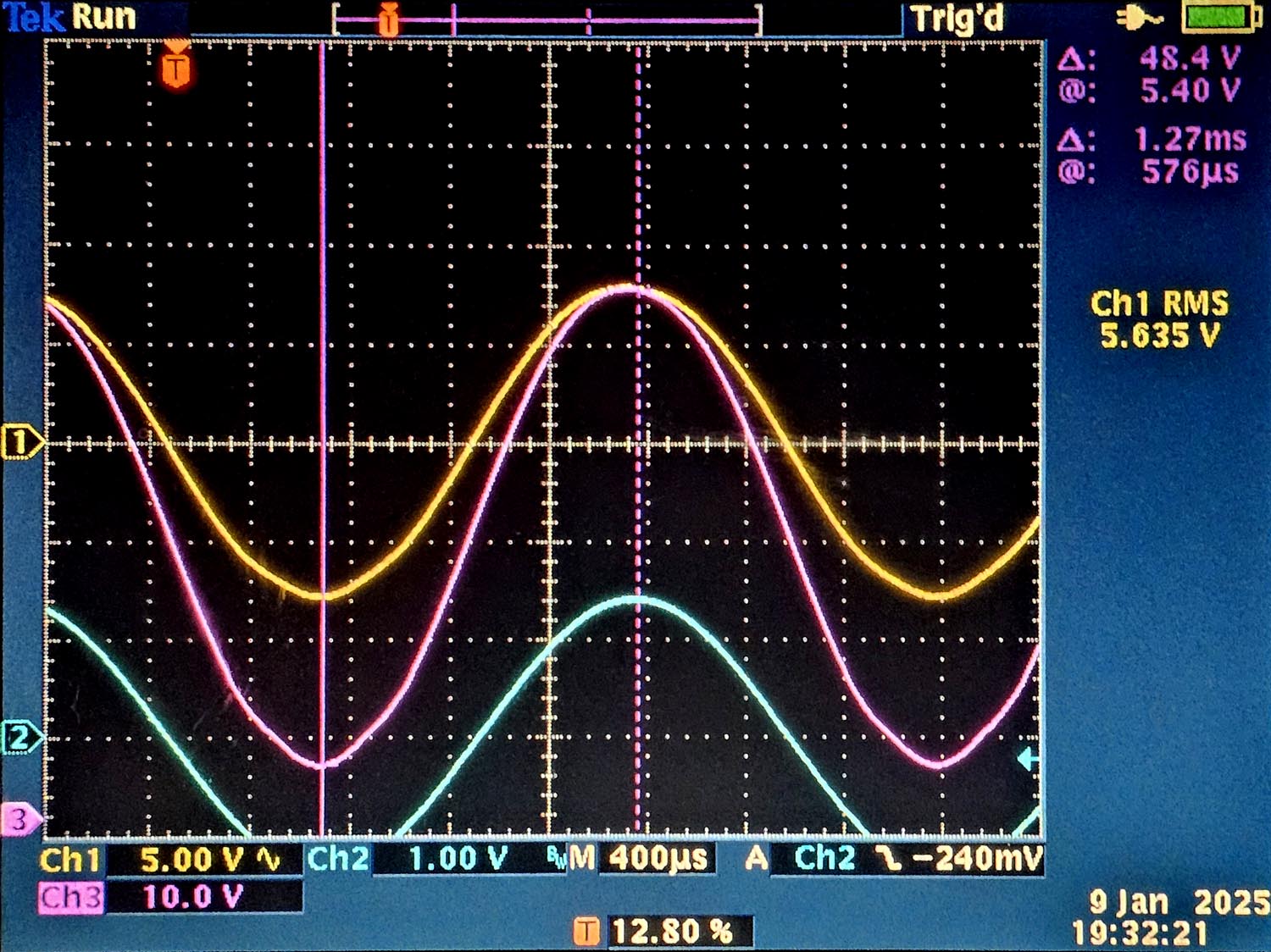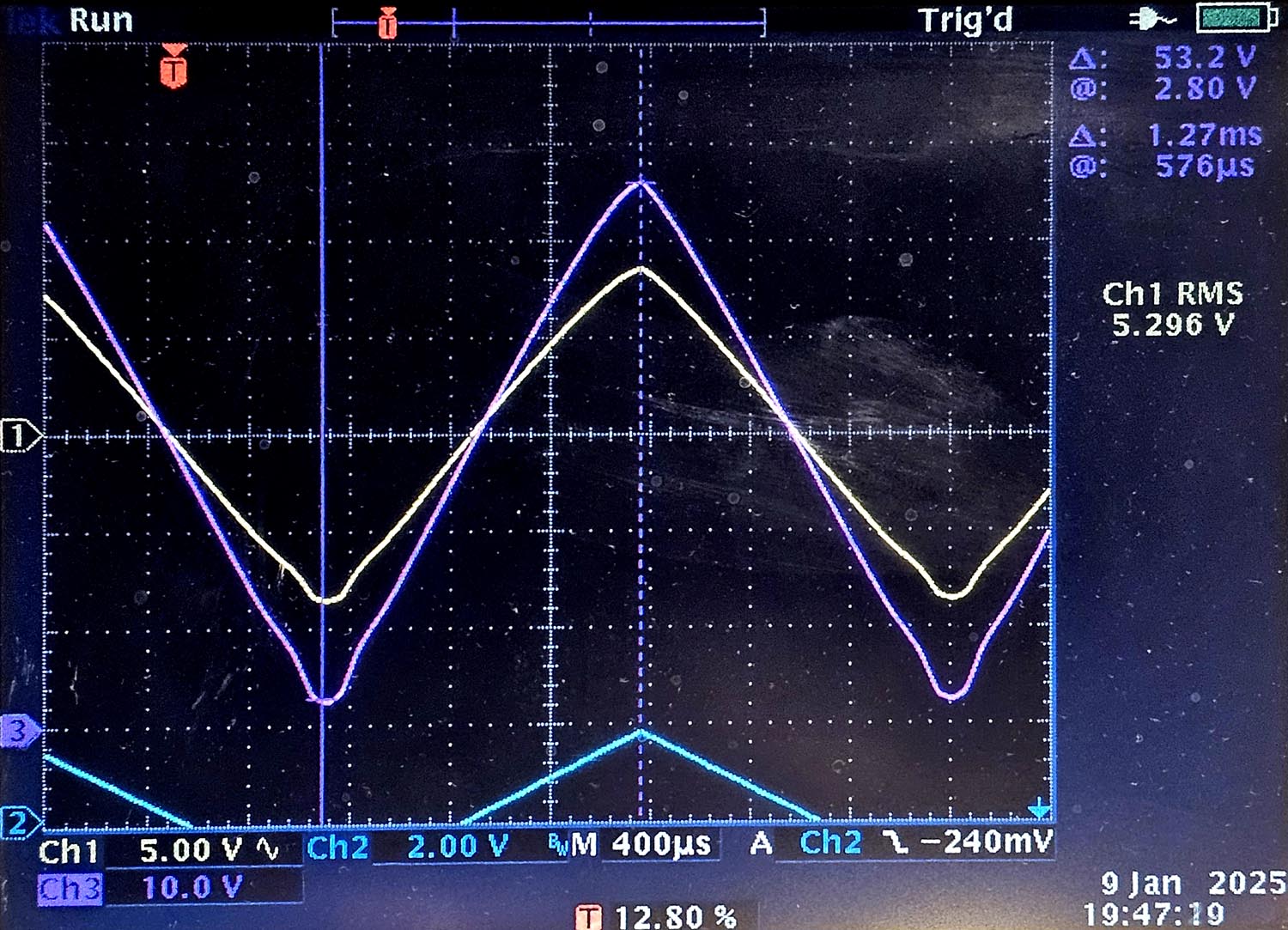 Le second osccilogramme est parficulier, j'ai notament mesuré la tension anodique (avec une sonde 10:1 car nous avons un sweep de 554V, ce qui est un peu trop pour l'oscilloscope).
