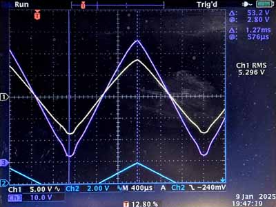 Le premier oscillogramme montre que latension anodique ne peut plus descendre si bas, la tension anodique minimale est de 54V. Nous voyons également un début de distorsion, qui apparait plus nettement avec un signal triangulaire. On ne peut pas faire de mesures avec un tel signal (sinus: mesure de la puissance, signal en créneaux: mesure des oscillations parasites). Par contre les distorsions sont très apparentes.