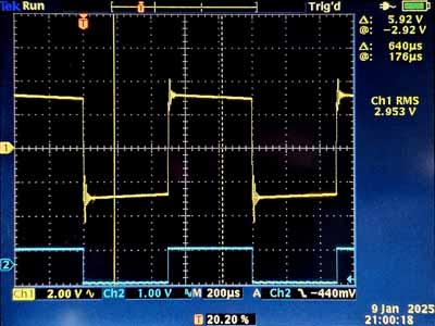 Les images d'oscilloscope dont parfaites et on croirait que l'ampli est parfaitement au point. Mais avec un signal en créneaux il y a des oscillations amorties. l'ampli n'a pas de limitation de la bande passante, qui est droite jusqu'à 50kHz. Je n'ai pas ajouté de circuit correctif, car cela dépend du transfo que vous utilisez.