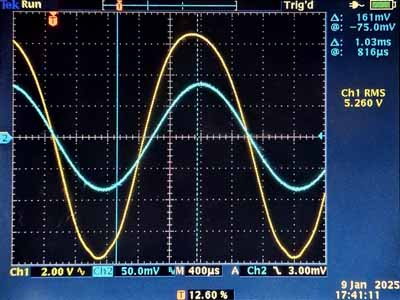 A droite un oscillogramme avec la contre réaction débranchée (tension d'entrée de 65mV effectifs). Nous voyons que le sinus n'est plus très beau, avec le pic positif aplati et le creux plus pointu. Un signa que la lampe aurait pu fournir un courant encore plus élevé.