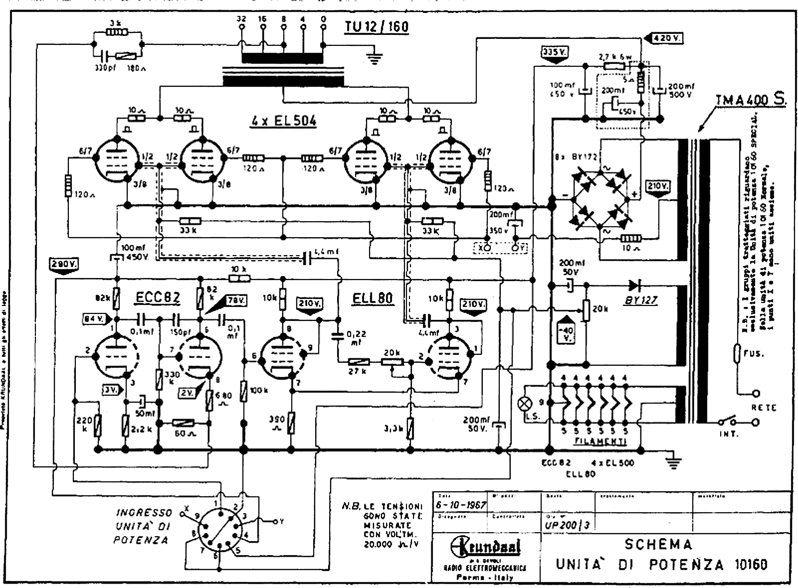 La première triode sert d'étage préamplificateur simple. La lampe ECC82 a un facteur d'amplification assez faible et le gain de cet étage est d'environ 15×. La seconde triode est montée en comparateur avec le signal de contre réaction qui arrive sur la cathode, c'est un système classique. Le signal de contre réaction est compensé en fréquence et il y a un petit condensateur de 150pF entre l'anode et la grille, tout cela pour assurer la stabilité de l'ampli. La lampe ELL80 est utilisée comme déphaseuse montée en triode. Il s'agit d'un déphaseur paraphase standard (la résistance cathodique commune de 390Ω est trop faible pour en faire un floating paraphase). On peut remplacer ce tube par un 12BH7 (double triode). Cette lampe peut fournir un courant plus élevé que la double triode ECC82. L'étage de puissance est un push pull avec 4 EL504. La polarisation de la grille de commande se fait par tension négative fixe. La tension d'alimentation est de 420V et la tension de grille écran est de 210V. La coupure entre le point X-Y permet de couper l'alimentation de l'étage de puissance: sans tension de grille écran le tube ne conduit plus.
