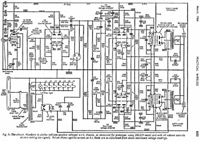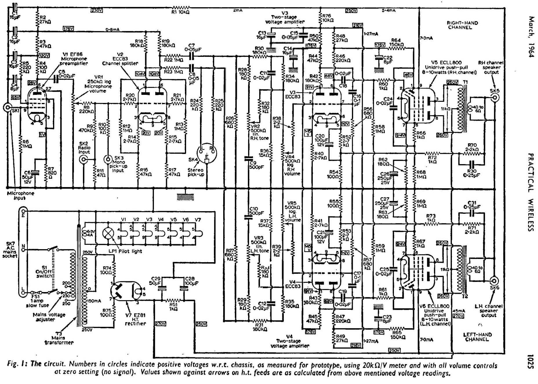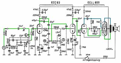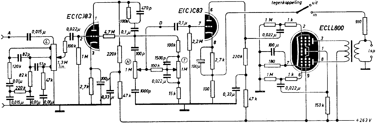 Le premier amplificateur en haut à droite reçoit comme signal d'entrée le signal d'un pick up à cristal, de là l'étrange montage à l'entrée qui sert à corriger la courbe de réponse des pick ups cristal. Grace à l'utilisation d'un ECC83, on peut ajouter un controle de tonalité étendu, la perte de signal étant compensée par la seconde triode.