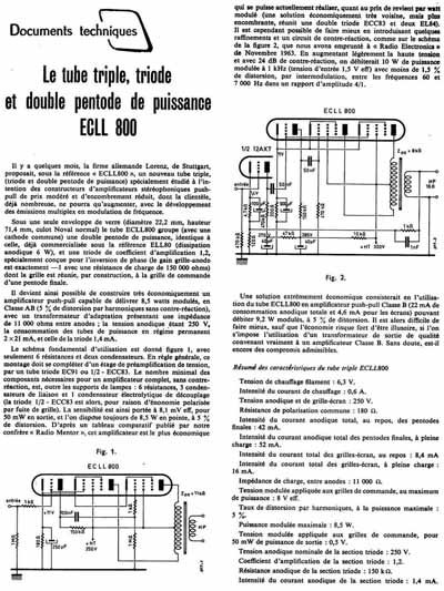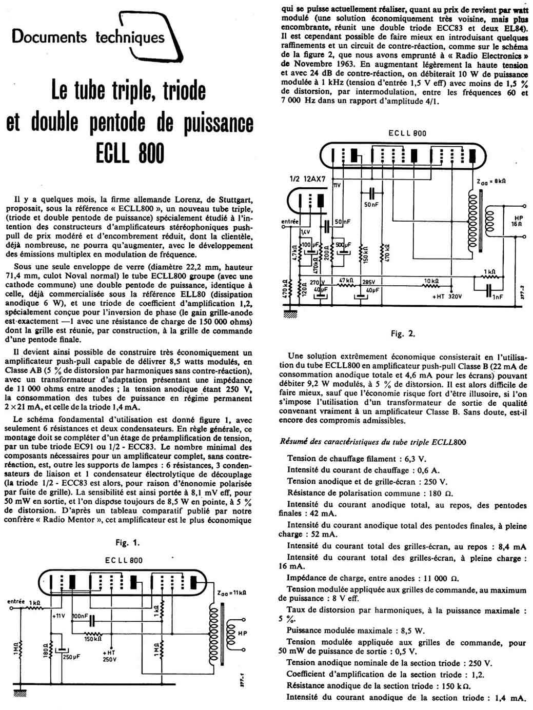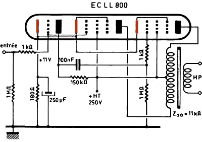 Le second schéma montre Le tube a été lancé à la fin de la période des tubes et les premiers amplificateurs à transistors au germanium faisaient leur apparition. On trouve donc très peu de tubes ECLL800 sur le marché NOS et la réparation d'un appareil dont les tubes sont défectueux passe presque nécessairement par une refonte complète de l'amplificateur. Il faut remplacer le tube ECLL800 par un tube ECC83 (une des deux triodes suffit) en branchement cathodyne et deux tubes EL90 ou EL84. On peut également reconstruire un ampli push pull complet avec deux tubes ECL86/PCL86, les deux triodes qui sont disponibles servent de préamplificateur et de déphaseur. On récupère l'alimentation et le transfo de sortie. Finalement il y a un descriptif du tube ECLL800 qu'on trouvait dans la presse de l'époque. Ce tube n'a pas eu le succès qu'il méritait à cause de l'arrivée des transistors. Les transistors donnaient un moins bon son, mais permettaient un montage plus simple (circuit imprimé). On pouvait se passer d'un boitier solide pour maintenir les deux transfos en place et on pouvait utiliser du carton renforcé à la place.