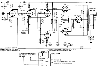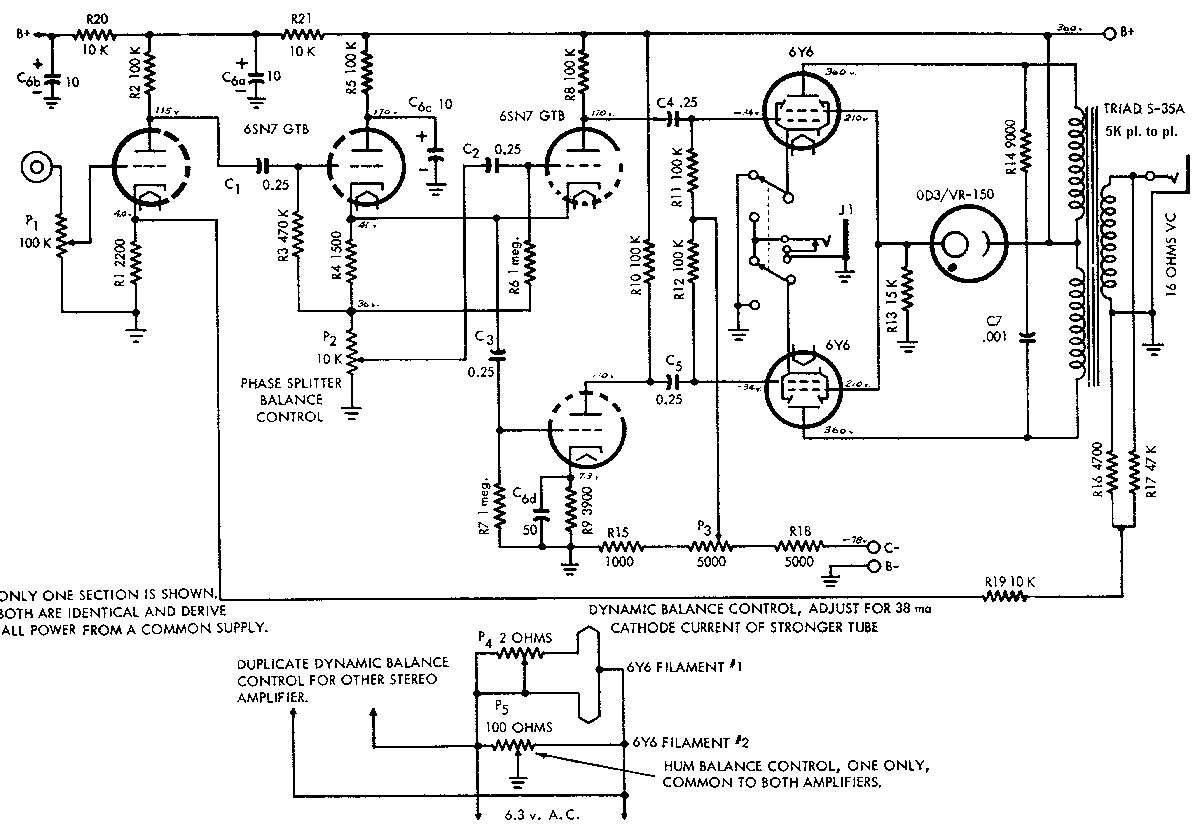 La puissance est donnée pour d = 10%. Le tube 6W6 peut fonctionner avec une tension de grille écran plus élevée, mais alors il faut utiliser une tension de grille de controle beaucoup plus négative et le tube devient moins sensible, ce qui n'est pas interessant. Le tube est aussi utilisé dans l'étage de puissance déflection trame, mais ici en mode triode (où l'anode (et la grille écran) peuvent avoir une tension de 1200V). La grille écran peut donc résister à une tension élevée, mais uniquement quand le tube est hors conduction. Le tube 6Y6 peut donc fonctionner sur une tension relativement faible: même avec une tension anodique de 130V il peut fournir une puissance de 3W. C'est donc un tube qui peut être utilisé dans un petit amplificateur construit avec des composants de récupération Le schéma d'un ampli push pull de 1957 est donné pour une puissance de 20W. Il utilise certains circuits qui n'ont plus été utilisés par la suite.
