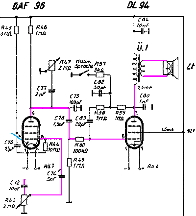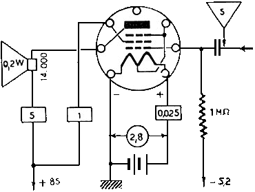 (*) en tenant compte d'une consommation supplémentaire de 3.5mA dans les étages précédents. Comme les cathodes sont à chauffage direct et qu'il n'y a qu'une seule pile pour le chauffage on ne peut pas utiliser des résistances cathodiques individuelles pour les tubes. Il faut une résistance cathodique commune de 820Ω pour arriver à une polarisation de 5.6V. Une polarisation fixe par tension négative est aussi possible, ce qui permet une légère augmentation de la puissance disponible. Le DL94 peut également travailler avec une résistance commune de 470Ω, cette valeur tient également compte d'un courant de 5mA dans les étages précédents. Ce tube consomme 100mA de courant de chauffage (les deux filaments en parallèle). La tension anodique maximale est de 120V, la dissipation anodique de 1200mW et le courant cathodique de 12mA. Ce tube est donc plus puissant que son successeur. Le DL94 peut également fonctionner sur 90V et produit une puissance sonore de 500mW (550mW avec une polarisation négative fixe de 8.8V).