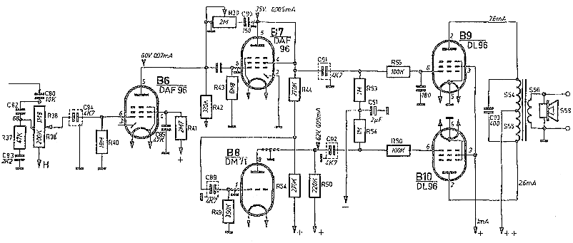 Les premières radios portatives sont mise sur le marché en Europe dans les années 1950. On avait déjà des radios fonctionnant sur batteries avant la seconde guerre mondiale, mais c'était surtout parce qu'il était difficile de faire autrement: tout le monde n'était pas raccordé au réseau électrique et le secteur produisait des parasites et des ronflements qui n'ont pu être éliminés qu'après la guerre. Pour pouvoir fabriquer des appareils portables il a fallu développer des tubes spécifiques qui n'avaient besoin que d'un courant de chauffe de 50 ou 25mA avec une tension de 1.4V (35mW), tandis qu'un tube normal a un courant de chauffe de 300mA sous 6.3V (1.9W). La tension de 1.4V est celle d'une pile zinc-carbone normale. Les tubes ne peuvent pas recevoir une tension de chauffage alternative. Pour pouvoir travailler avec une puissance de chauffe 50× plus faible il faut utiliser des cathodes à chauffage direct (le filament sert de cathode). Le courant que le tube peut fournir est limité à 5 ou 10mA, même pour les tubes de puissance. La haute tension est de 90V (ou moins), c'est la tension normale d'une pile "haute tension". On perd encore 5V sur la résistance cathodique, la tension anodique utilisable est de 85V. Les radios portatives à lampes sont décrites sur cette page. Il y a une différence notable avec les lampes utilisées dans les autoradios. La puissance dissipée dans le filament n'est pas un problème ici, au contraire on utilise même des lampes avec courant de chauffe plus important pour arriver à un facteur d'amplification suffisant. Ces radios recevaient la haute tension via un trembleur, mais on a également développé des tubes spécifiques qui pouvaient fonctionner avec une tension de 12V pour pouvoir éliminer le trembleur peu fiable. Il y a plus d'informations sur les autoradios à lampes ici. On va remplacer le tube de puissance des radios portables par des transistors, mais la partie radio (haute et moyenne fréquence) se compose toujours de tubes, les transistors ne pouvant pas monter en fréquence. Les pentodes DL94 et DL96 ont moins été utilisées ques les autres tubes de la série DF96, DK96, DAF96,... On n'a pas fabriqué d'amplificateurs basés sur ces tubes: la puissance est tout simplement trop basse et il y a sufisamment de tubes valables. Ces tubes spécifiques étaient également fort chers en comparaison des tubes standards. Mais il est possible de réaliser un petit amplificateur basé sur ces tubes. La dissipation maximale du DL96 est de 600mW et le courant cathodique maximal (en pointe) est de 10mA. Pa possible d'arriver à une puissance élevée avec un tel tube.
