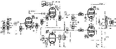 L'étage préampli est un DAF96 dont la diode est utilisée pour la détection AM, c'est une pentode audio avec diode de détection. Le réglage de tonalité limite les fréquences élevées et le commutateur musique/paroles modifie la contre réaction. Le tube de puissance est utilisé en dela de ses limites avec un courant anodique de 7.5mA et une haute tension de 92V (fonctionnement sur secteur). Le push pull emploie également un DAF96 commez préampli, le courant anodique est limité à 70µA. Ce tube est suivi d'un second tube identiuque pour arriver à une amplitude suffisante pour commander l'étage de puissance. Le DM71 est en fait un indicateur d'accord qu'on utilise ici comme triode (avec un gain très faible de 2.5×). L'illumination du tube peut servir d'indicateur de marche. Le déphaseur est une paraphase classique, le seul système possible pour arriver à un déphasage avec des lampes à chauffage direct.. L'étage de puissance a un courant de repos de 2.6mA par tube. Cet amplificateur permet une puissance maximale de 440mW. Il est recommandé d'utiliser une polarisation négative fixe (-5.6V) pour ne pas perdre de puissance dans la résistance cathodique. Réglez les tensions individuellement par tube pour arriver au courant de repos correct. Une haute tension de 90V est moins dangereuse qu'une haute tension de 250 - 300V comme dans les amplificateurs plus puissants. Pour arriver à une telle tension on peut utiliser un transfo de 30V dont on double et filtre la tension. La consommation haute tension d'un amplificateur complet est de 20mA à puissance maximale. On peut arriver à la tension de chauffage à partir d'un transfo basse tension (5V environ) et on utilise un régulateur de tension pour arriver au 1.4V (il y a une dissipation de 4W dans le régulateur). On alimente tous les filaments en parallèle pour la facilité, ce qui nous donne un courant total d'environ 500mA avec les étages préamplificateurs. Si on branche les filaments des tubes de puissance en série (sur 2.8V) il faut ajouter une résistance en parallèle entre le filament négatif et le point commun des filaments pour égaliser le courant dans les deux branches du filament, en tenant compte du courant cathodique qui fait environ 20% du courant de chauffage. Ce n'est pas une cathode équipotentielle. C'est surtout le cas avec le DL96 qui a un très faible courant de chauffage. |