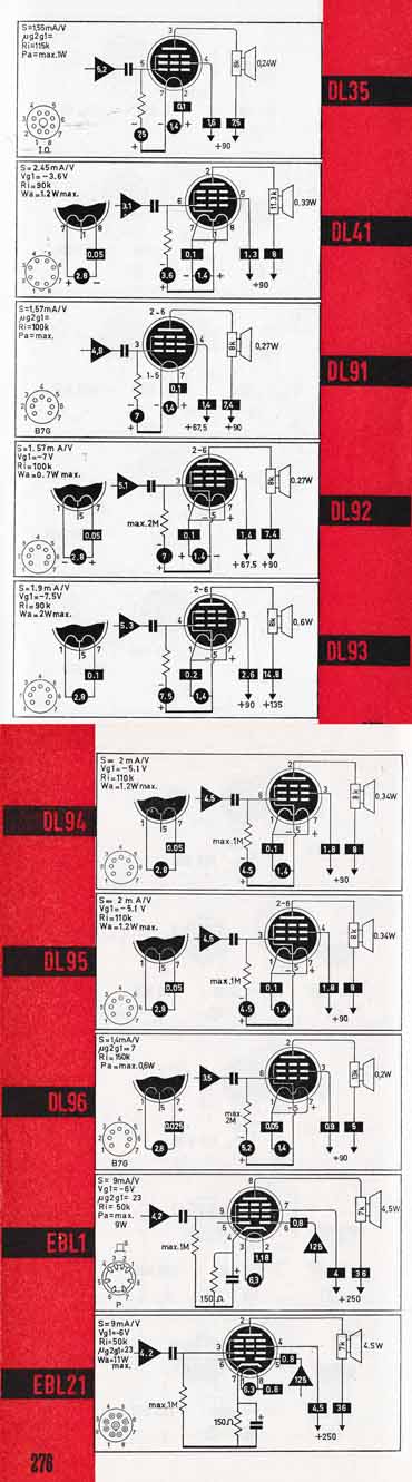 DL35: un tube qui est apparu en 1939, mais qui n'a été utilisé qu'après la seconde guerre mondiale dans des radio portables. C'est un tube au format octal qui est fort grand pour une radio portable. Le tube permet une puissance de 240mW pour une haute tension standard de 90V (7.5mA). Le DL41 est une lampe au soquet B8A (rimlock) for utilisé juste après la seconde guerre mondiale et remplacé assez vite par le soquet miniature. Ce tube permet une tension d'alimentation de 150V, l'amplificateur fournit alors 600mW. La dissipation anodique maximale est de 1.2W. Ce tube pouvait également être utilisé en push pull classe AB, fournissant une puissance de 1.85W avec un taux de distorsion très acceptable de 3.5% (Ua = Ug2 = 150V, Ia = 1.5 - 10mA). La tension alternative sur la grille de commande doit alors être de 10V. C'était un tube conçu pour les radios tous courants (secteur et accus), à utiliser dans les régions qui n'étaient pas encore raccordées au réseau électrique. En mode économique le tube nécessite un courant de chauffage de 500mA sous 1.4V, courant anodique de 4mA sous 90V (Ig2 0.8mA) pour une puissance de 250mW. Les tubes DL91 et DL92 ont des caractéristiques pratiquement identiques. Le DL91 a un facteur d'amplification un peu plus élevé et nécessite une tension alternative de commande de 4.9V pour arriver à la puissance maximale. Ces lampes ont été mises sur le marché en 1946, ce sont un des premiers tubes avec le soquet miniature. On a surtout utilisé le DL92. Puissance de 270mA, haute tension de 90V, courant anodique de 7.4mA. Le DL93 est surtout connu via sa version américaine 3A4 qui a été lancée pendant la guerre. C'est une lampe pouvant fournir une puissance plus élevée, la pentode était également utilisée comme tube émetteur dans les walkie talkies. Le courant de chauffage sous 1.4V est de 200mA. La dissipation anodique maximale est de 2W, le courant anodique maximal est de 18mA et la haute tension peut monter à 150V. La tension de la grille écran doit être de 90V au maximum. Alimenté en 135V, le tube fournit une puissance maximale de 600mW. Les paramètres pour un fonctionnement en push pull ne sont pas connus. Les lampes DL94 et DL95 sont également identiques, on retrouve principalement le DL94. La puissance audio disponible est un peu plus élevée qu'avec le DL91/DL92 avec un courant anodique de 8mA au lieu de 7mA. Le DL96 est la dernière lampe de la série, lancée en 1954. Elle est caractérisée par un courant de chauffe encore plus faible de 50mA sous 1.4V. La puissance disponible est de 200mW avec une haute tension de 90V. Un fonctionnement en classe AB est également possible, avec une puissance de 420mW. Le courant anodique est alors de 3.25 - 4.75mA/tube. La dissipation anodique maximale est de 600mW, mais c'est plus causé par la tension et le courant maximal (90 X 5mA) que par les dimensions de l'anode. En mode économique (un seul filament alimenté) la puissance est de 100mW. En général les postes de radio n'avait pas de sélecteur normal/économique, car le changement de mode de fonctionnement modifie également l'impédance de sortie (de 15 à 30kΩ). Si on ne modifie pas le transfo de sortie la puissance est encore moindre et ce mode de fonctionnement est destiné à l'écoute sur casque, où une puissance de 50mW est amplement suffisante.