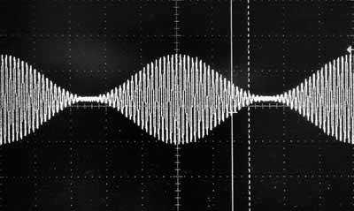 Mais voyons comment les ingénieurs ont résolu le problème du transfo à entrefer... Voici le schéma de la partie audio d'une radio des années 1950. A cette époque, pas de fioritures, le circuit le plus simple possible. Pas de transfo d'entrée, la radio est connectée directement au secteur (ce qui permet une alimentation en continu et éventuellement une alimentation sous 110/130V). Les tubes sont de type "Uxxx" qui indique un courant de chauffe de 100mA. On perd 10W en puissance de chauffage dans la résistance de 950Ω, mais cela permet au fabricant d'économiser le transfo d'alimentation. Le redressement est monophasé et il y a un ronflement assez important. Mais les ingénieurs ont trouvé le truc qui va à la fois réduire les ronflements à 50Hz et le courant permanent dans le transfo. Le tube de puissance est un UL84, un tube adapté à une tension plus basse (ce n'est sûrement pas l'équivalent du EL84!). Le courant est le plus élevé possible (69mA), ce qui produit une dissipation de 0.9W sur la grille écran et de 11.1W sur l'anode. Le tube est utilisé très près de ses limites, comme pratiquement tous les tubes dans les montages SE. Ce courant qui est relativement important nécessiterait un gros transformateur avec un entrefer important dans un appareil normal. Mais le transfo est assez spécial: la haute tension arrive par le milieu du bobinage primaire. Là, le courant se divide en deux, une partie est le courant anodique, l'autre partie est le courant qui va aux autres parties de la radio (et fournit également la tension pour g2). Le courant anodique permanent de la pentode est ainsi compensé en partie par le courant "radio", ce qui permet de réduire la taille du transfo. Ce montage a naturellement aussi des inconvénients, il y a une perte de puissance audio, mais cela n'était pas très important à l'époque: certaines radios avaient un tube de puissance qui ne pouvait fournir qu'un watt et demi avec 10% de distorsion. La perte de puissance est causée par la résistance de 2.7kΩ qui forme une résistance de charge car un coté est mis à la masse via un condensateur électrochimique. A droite on peut voir l'influence d'un signal basse fréquence de 25Hz (que l'ampli ne peut pas reproduire) sur un signal de 1125Hz. La fréquence de 25Hz n'est présente que par la modulation qu'elle produit, en amplifiant plus ou moins le signal de 1125Hz. Sans cette dernière fréquence on ne remarquerait pas le 25Hz (image de création à des fins illustratives)