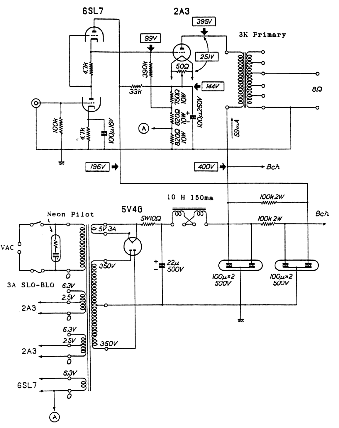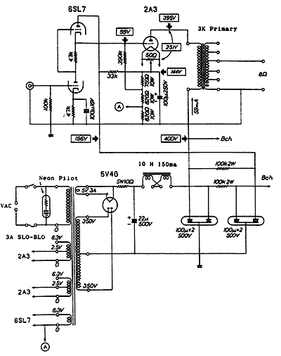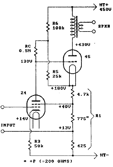 Le montage à gauche est une réalisation moderne qui utilise un 6SL7 (double triode en montage SRPP) et un 2A3 comme triode de sortie. La tension d'alimentation est de 400V avec un courant de 59mA (consommation HT= 24W). La puissance disponible est de 3.5W avec un taux de distorsion de 2.5%. Je peux vous dire qu'il y a des amplificateurs qui font mieux que cela. Il n'y a pas de contre réaction et on ne trouve aucun condensateur dans le signal audio. Chaque triode de puissance qui est à chauffage direct a un rhéostat pour déterminer le point où le ronflement de secteur est le moindre. A controler le premier mercredi du mois. Le point de fonctionnement correct est déterminé par les résistances cathodiques et il aurait peut être été plus judicieux d'utiliser une seule résistance de 27kΩ 20W et un second petit diviseur en parallèle avec un ajustable pour déterminer le point de fonctionnement. |