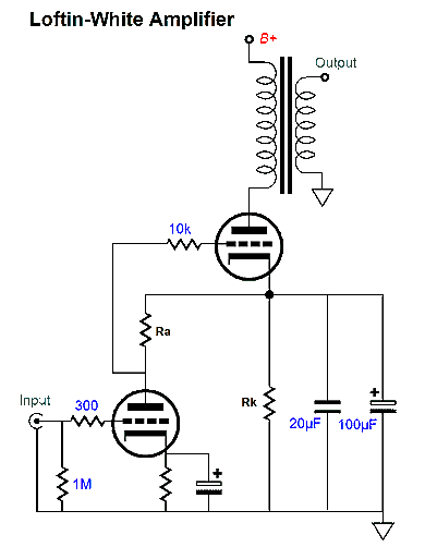 | Le montage Loftin-White est une version spéciale de l'amplificateur single ended qui permet d'éviter le condensateur de couplage entre le préampli et l'étage de puissance. |