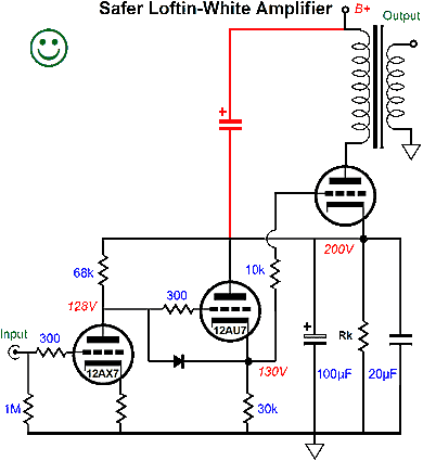 Version plus moderneLe premier circuit montre le montage de base: une triode préamplificatrice commande directement la grille du tube de puissance. Comme le courant dans le tube de puissance est plus élevé que celui dans le tube préamplificateur, on utilise une résistance cathodique pour le tube de puissance. Remarquez l'absence totale de condensateurs de couplage (les puristes vont aimer...). Le condensateur électrochimique de la cathode du tube de puissance est découplé par un condensateur non polarisé.Ce montage a un inconvénient de taille: si le tube préamplificateur est absent, on grille rapidement le tube de puissance, la grille du tube de puissance n'ayant plus de tension négative par rapport à sa cathode. La tension d'alimentation doit être d'environ 500V, ce qui est quand même beaucoup pour un amplificateur qui ne fournit que quelques watts. La dissipation dans la résistance cathodique est de plus de 10W, ce qui réduit encore plus le rendement (déjà pas fameux) d'un amplificateur single ended.
