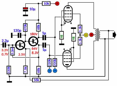 Un amplificateur classique se compose d'un tube préamplificateur 1 (par exemple une moitié d'un tube ECC83), suivi d'un étage déphaseur 2, qui fournit les deux signaux déphasés à 180° pour les pentodes de puissance. On peut ici utiliser la seconde triode d'un ECC83. On termine par deux pentodes de puissance 3, par exemple une paire de EL84. Pendant la seconde guerre mondiale (et après) on a fabriqué des amplificateurs push pull sans étage dephaseur, c'est le montage SIPP ou self inverting push pull. Si on désire une puissance de plus de 10 à 15W, il faut passer à des tubes plus puissants, comme les tubes EL34. Ces tubes ont également besoin d'un signal d'attaque plus puissant. Il faut alors nécessairement utiliser un déphaseur mieux adapté: soit un montage long tail (déphaseur de Schmidt) qui utilise deux triodes, soit un montage Williamson qui en utilise trois (en plus de la triode préamplificatrice). Le déphaseur long tail est souvent appellé Mullard, car il était utilisé dans pratiquement tous les amplificateurs en kit de Mullard. En France on utilise plutot le nom de déphaseur de Schmidt. La liste des montages déphaseurs se trouve ici. A partir de ces circuits développés dans les années 1950, on peut actuellement construire des amplificateurs avec de très bonnes caractéristiques. A l'époque, la puissance était donnée pour un taux de distorsion de 1% ou plus. Les avantages et inconvénients sont montrés ici, avec de nombreuses images d'oscilloscope qui montrent le passage graduel de la classe A à la classe AB quand on augmente la puissance. Une page plus théorique avec les courbes de fonctionnement des pentodes et tétrodes en montage single ended et push pull. Un amplificateur de Velleman qui pouvait être fourni en kit ou prêt à l'emploi. La configuration de Williamson est souvent utilisée quand une puissance élevée est nécessaire.
