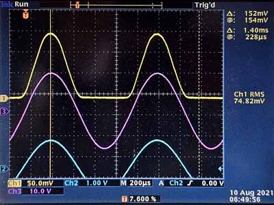 La tension maximale sur la résistance est de 64mV, ce qui correspond à un courant de 64mA par tube. La haute tension est de 325V, mais la dissipation anodique n'est pas de 20.8W (c'est la dissipation maximale en pointe). Chaque tube n'est en conduction que pendant la moitié du temps et quand un tube est en conduction sa tension anodique diminue.