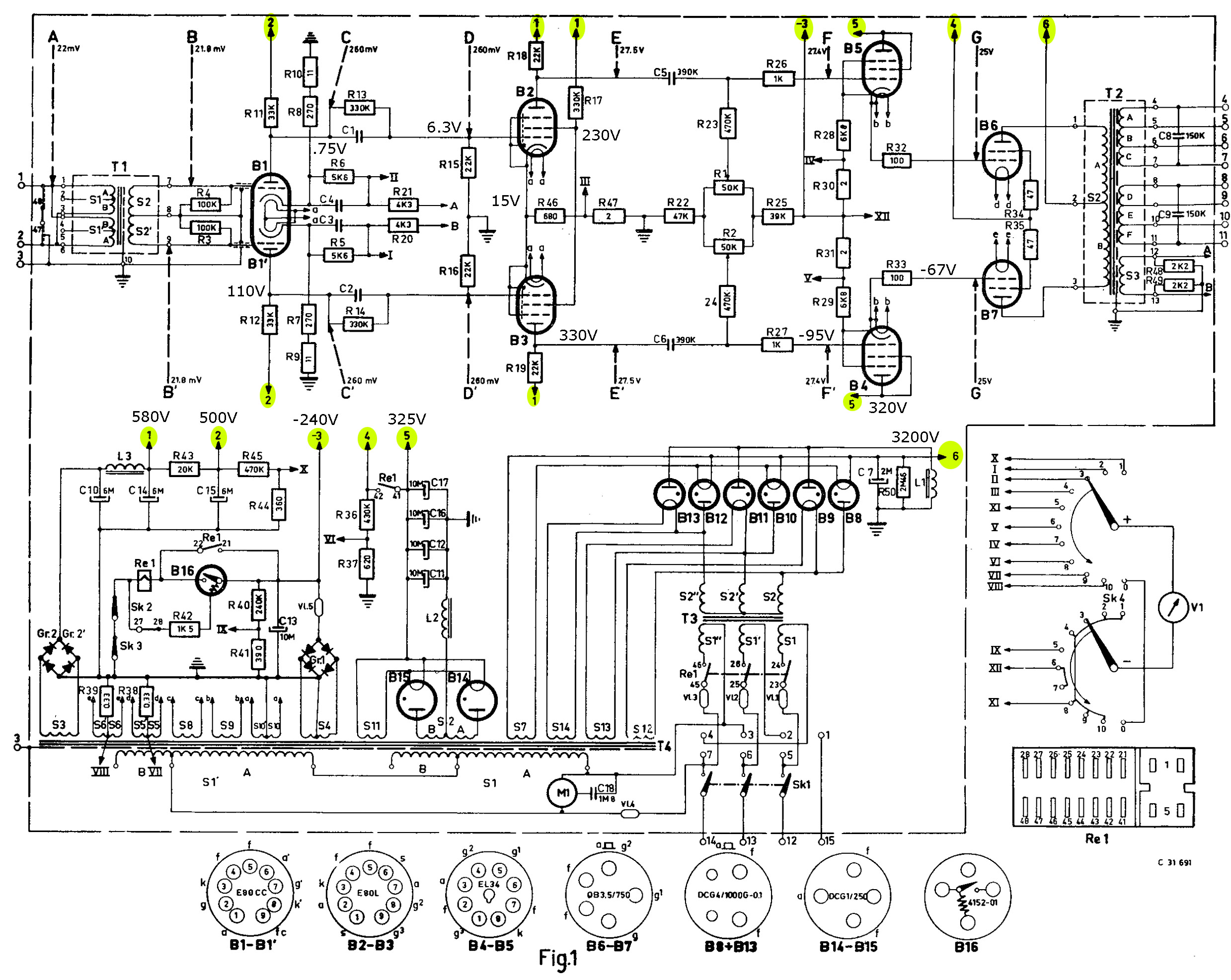 On remarque tout de suite que l'appareil travaille avec des tensions très élevées, qui ne sont pas nécessaires pour l'étage préamplificateur: 500V pour un tube qui produit un signal en sortie de 260mV (3.3V p-p à puissance maximale). Les tensions alternatives sont mesurées avec l'étage de puissance hors fonction (pas de haute tension 3kV). Pour arriver à la puissance maximale (avec la contre réaction active) il faut un signal à l'entrée de 1.65V. A puissance maximale il faut multiplier toutes les tensions alternatives par 4.5. Les tensions alternatives sont des tensions effectives (RMS). Le premier tube est une double triode à grille cadre E80CC. Cette triode est actuellement fort recherchée par les mélomanes à cause de ses très bonnes caractéristiques. Chaque triode peut dissiper au maximum 2W et le courant maximal est de 12mA. Le tube a une transconductance de 2.7mA/V et un facteur d'amplification de 18.5 avec une résistance anodique de 47kΩ. Ce tube n'a donc pas un facteur d'amplification très élevé, mais a une courbe très linéaire, identique pour les deux triodes. La grille cadre est ici utilisée pour avoir des caractéristiques optimales. Dans cet amplificateur le tube est utilisé très près de ses limites, avec un courant anodique de 11.8mA et une dissipation de 1.3W. L'étage est symmetrique et a un transformateur d'isolation (qu'on retrouve souvent dans de tels amplificateurs). Le transformateur d'isolation permet un montage symmétrique pour tout l'amplificateur (ce qui permet de réduire le ronflement de secteur, car les condensateurs de filtrage ont une très faible valeur de 6 + 6 + 6µF. La contre réaction arrive sur les deux cathodes, c'est le même système qu'avec un amplificateur classique, mais ici tout est symmétrique. Pour le second étage on utilise deux pentodes E80L. C'est une pentode qui est utilisée dans les amplificateurs très haut de gamme, soit comme étage de puissance (pour une puissance push pull de 5.7W) ou comme étage d'attaque d'un tube plus puissant. La dissipation maximale du tube est de 8W pour un courant maximal de 50mA. Le tube est utilisé ici avec un courant anodique de 11.4mA et une dissipation anodique de 3.6W. Pépère, quoi.C'est cet étage qui produit la plus forte amplification, il fait passer le signal sonore de 260mV à 27.5V. Le tube de puissance EL34 qu'on retrouve comme étage final dans beaucoup d'amplificateurs est ici utilisé comme étage d'attaque en configuration cathode suiveuse. Cet étage n'a donc pas d'amplification en tension. Le courant anodique dans le tube est de 24.4mA et la dissipation est de 9.5W. La polarisation des tétrodes de puissance est assurée par la polarisation de ces deux tubes d'attaque. Ce sont les seuls réglages à effectuer dans l'amplificateur.