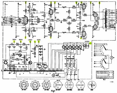 Il s'agit d'une tétrode avec une caractéristique très typique: la tension anodique ne peut pas passer sous la tension de la grille écran pour éviter les oscillations parasites (qui à une telle puissance seraient désastreuses pour les haut parleurs). Le condensateur de filtrage de l'étage de puissance ne fait que 2µF: il était très difficile d'atteindre des valeurs élevées à cette époque (il ne s'agit probablement pas d'un condensateur électrochimique, impossible à fabriquer pour une tension de claquage si élevée). L'amplificateur fournit une tension de 100V dans une résistance de 10Ω: tous les amplificateurs de puissance élevée ont une tension de sortie de 100V, qui est une des tensions standardisées. La tension peut être de 70V pour les amplificateurs de puissance plus faible et monter à 200V pour les amplificateurs plus puissants. Cette tension plus élevée permet de transporter le signal sur de plus longues distances. Malgré la contre réaction globale qui agit sur 4 étages on a un fonctionnement stable et il ne faut pas d'artifices pour empècher les oscillations parasites. Le taux de contre réaction est de 24.4dB. Le facteur d'amortissement est de 10. Pour l'alimentation on retrouve un peu de tout: