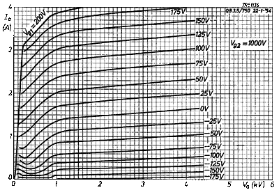 La tension maximale est de 4000V, la dissipation de 250W et le courant anodique de 350mA. Le tube peut fonctionner en classe AB2 avec un courant de grille de commande maximal de 20mA. Si le tube ne peut fonctionner qu'en classe AB1 (pas de courant de grille de controle), la puissance est limitée à 600W. Le tube fonctionne ici avec un courant de repos de 50mA qui peut monter à 275mA (le courant de grille écran va de 0 à 34.5mA par tube). Pour avoir la puissance maximale, il faut une tension d'attaque entre les deux grilles de commande de 250V effectifs. Donc 320Vpp sur chaque grille de commande. C'est possible grace à la tension négative de -240V.