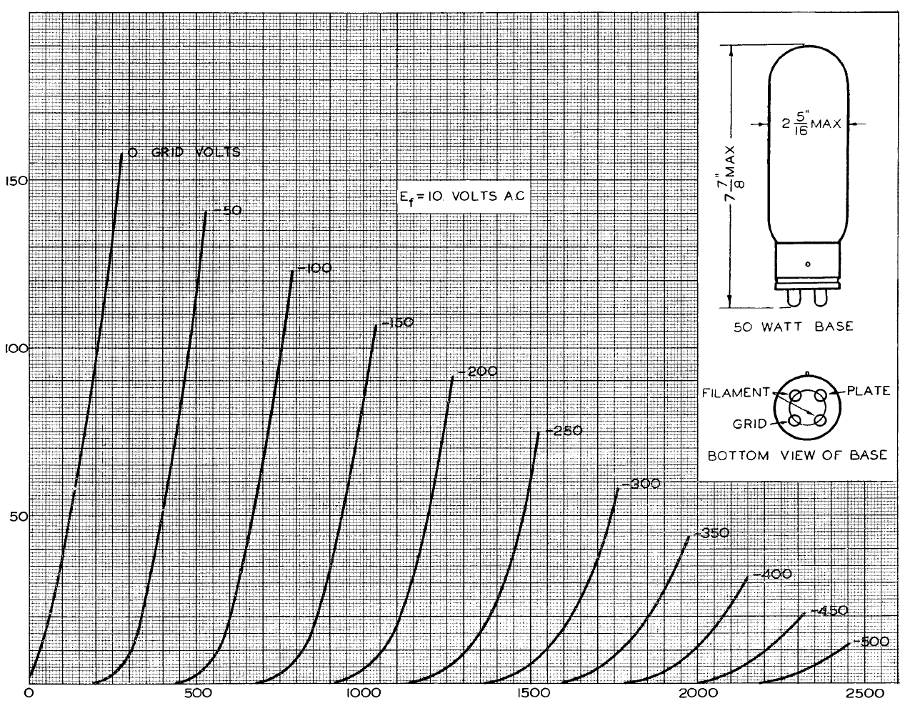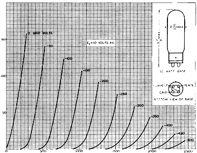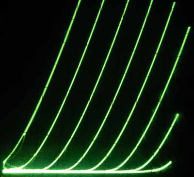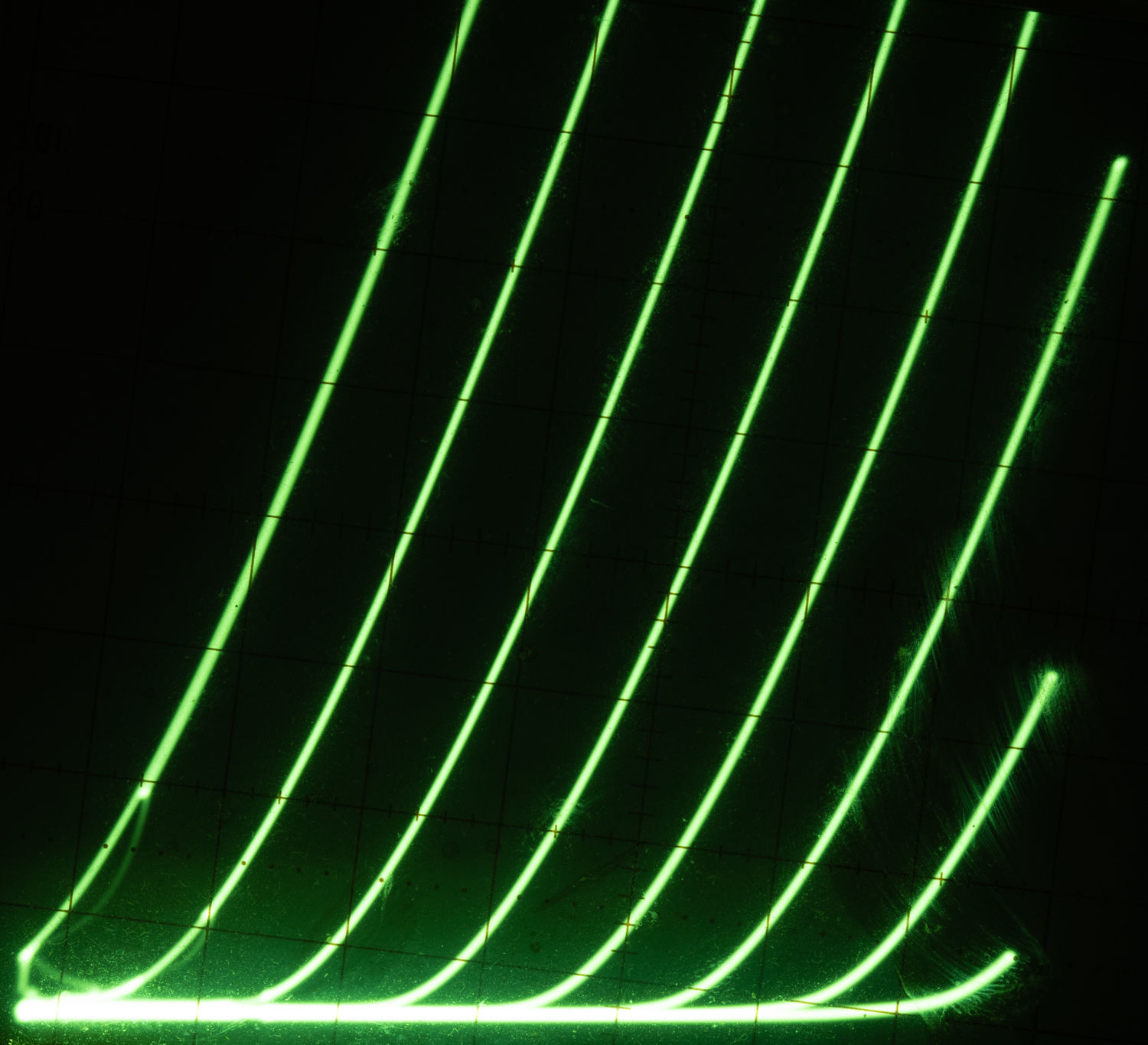 Triode américaine 845La triode à chauffage direct est un "bright emitter" a une cathode en tungstène thorié qui doit être chauffée à environ 1400° pour émettre des électrons. Le métal a une couleur jaune-blanc. Une fois que des tubes plus modernes ont été produits (à cathode recouverte d'oxide de barium) on a balancé ces anciens tubes aux oubliettes (sauf pour les puissances les plus élevées).Le problème ici c'est qu'aucune spécification n'est donnée pour le tube. On voit quelques photos, mais pas de points de fonctionnement ni de limites de fonctionnement. Le 845 fonctionne avec une tension d'alimentation de 1250V (pour obtenir la puissance la plus élevée) et a besoin d'une tension d'attaque de 400Vpp (140Vrms). C'est un tube avec des caractéristiques extrèmement linéaires, mais il est difficile à utiliser. Les distorsions proviennent principalement de l'étage d'attaque car il n'y a pas beaucoup de triodes préamplificatrices qui peuvent fournir un sweep de 400V (la tension d'alimentation doit être de plus de 500V). L'image d'oscilloscope montre les caractéristiques du 845: en horizontal la tension anodique et en vertical le courant anodique. Plusieurs tracés sont dessinés, chaque fois avec une tension de grille différente: 0V, -50V, -100V,... Il existait à l'époque des appareils spéciaux pour fournir les différentes tensions variables. Les signaux étaient envoyés à un oscilloscope et s'il fallait prendre une photo on utilisait un long temps de pose. On voit que les courbes sont parfaitement équidistantes pour une tension de grille allant de 0 à -200V (et même -250V si vous voulez une coloration avec des harmoniques paires). C'est un signe que le courant anodique est parfaitement proportionnel à la tension de grille. Les courbes sont droites à partir d'un courant de 20à 30mA.