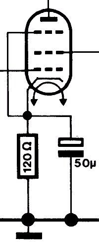 ![]() Polarisation par résistance cathodiqueLa résistance de cathode produit une chute de tension, rendant la cathode positive par rapport à la grille qui est maintenue à la masse. La résistance de la grille a généralement une valeur plus basse.Image à gauche: la polarisation normale d'un étage préamplificateur. La résistance cathodique est découplée pour ne pas diminuer le facteur d'amplification du tube. Dans certains cas on utilise des résistances de cathode non-découplées pour stabiliser le gain d'un étage. Cela se fait surtout dans les étages de préamplification. Un inconvénient d'une résistance de cathode non-découplée c'est l'augmentation de la résistance interne du tube: ce procédé n'est que peu utilisé et jamais pour les étages de puissance.